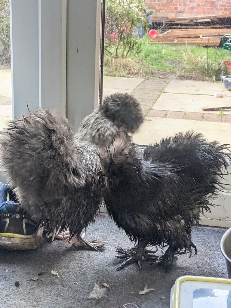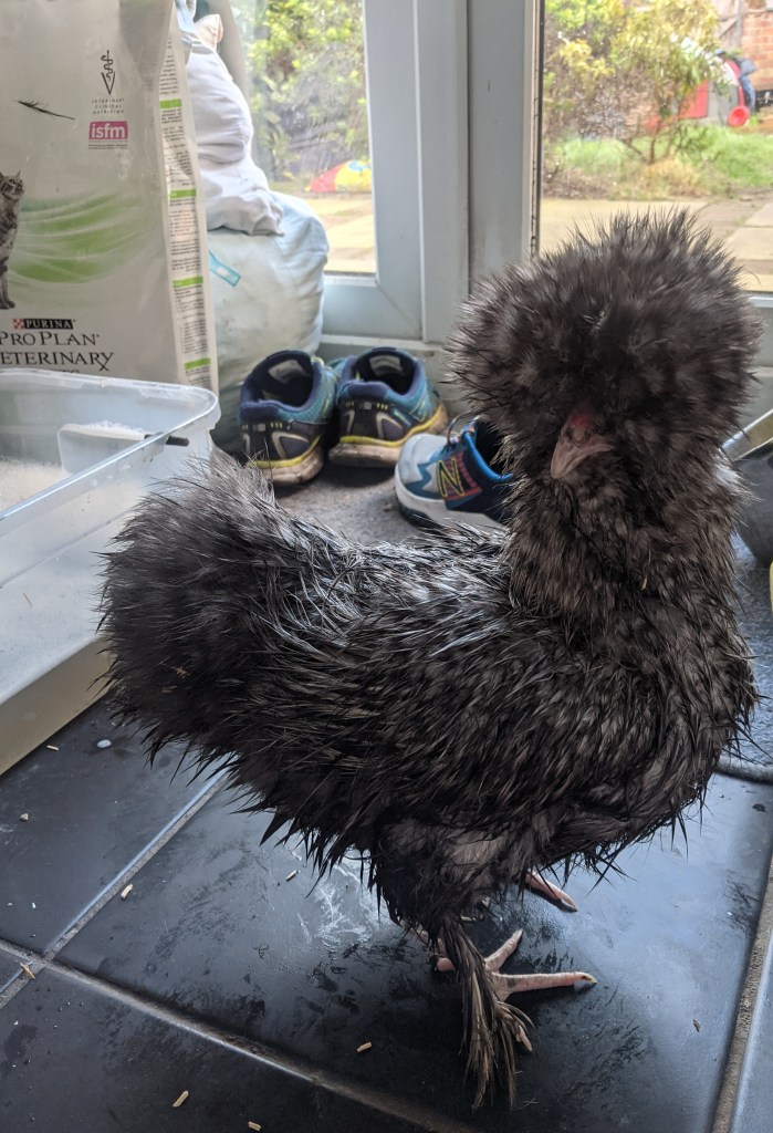 Next was Stratus. She is an incredibly highly strung bird with an intense dislike of being held. Nearly catching me a black eye as she flapped her wings, she also was hastily dumped into a fresh bath. She tolerated it quite well until she had had enough. With a huge disgruntled shriek, she leapt from the bath, dowsing me in bath water. For good measure, she shook herself like a dog, covering any of my remaining dry patches. Shouting for my husband, I decided to take the opportunity to trim her feathers around her eyes. Cuckoo silkies can have issues with their feathers growing into their eyes causing irritation. The solution is to trim them regularly. Sounds so simple doesn’t it? Stratus, already irate, did not make it easy. She kept moving her head at exactly the wrong moment, prolonging the ordeal. Eventually, I was fairly confident that I could do no more without risking injury (either to Stratus or myself), my husband put her down with the others. She refused to go anywhere near us for the next hour! Two down, one to go.