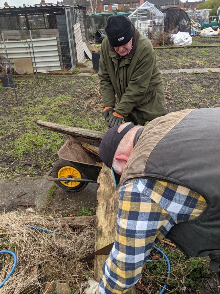 Today, apart from feeding the chickens, Cliff, Geoff and I helped clear a half plot for a fellow plot holder. The plot needs quite a bit of work, specifically removing old bricks, broken glass and wood as well as the usual weeds. Geoff had done a great job removing some of the wood yesterday and together, we finished the job. Cliff and Geoff worked on cutting up the longer pieces, I