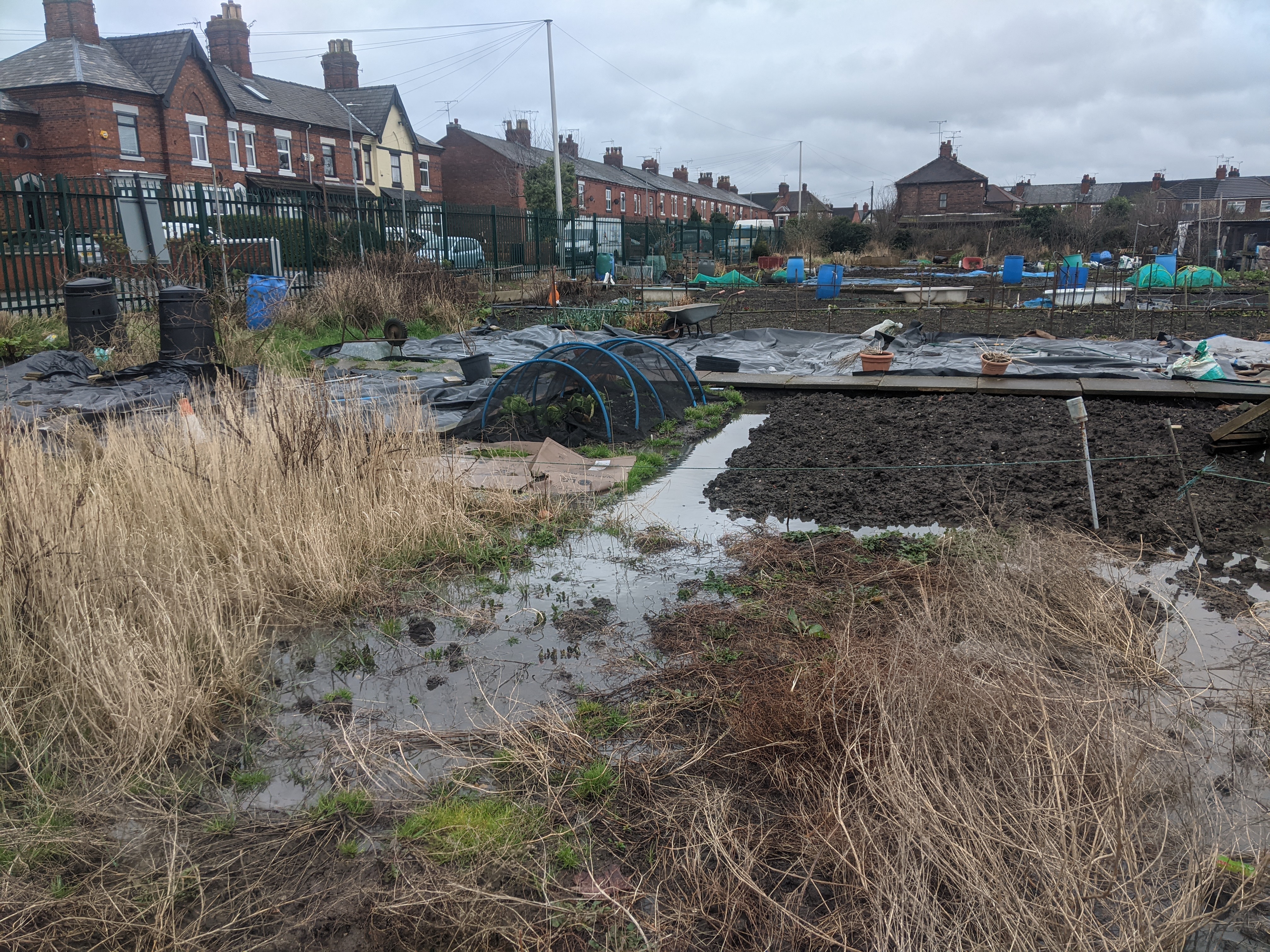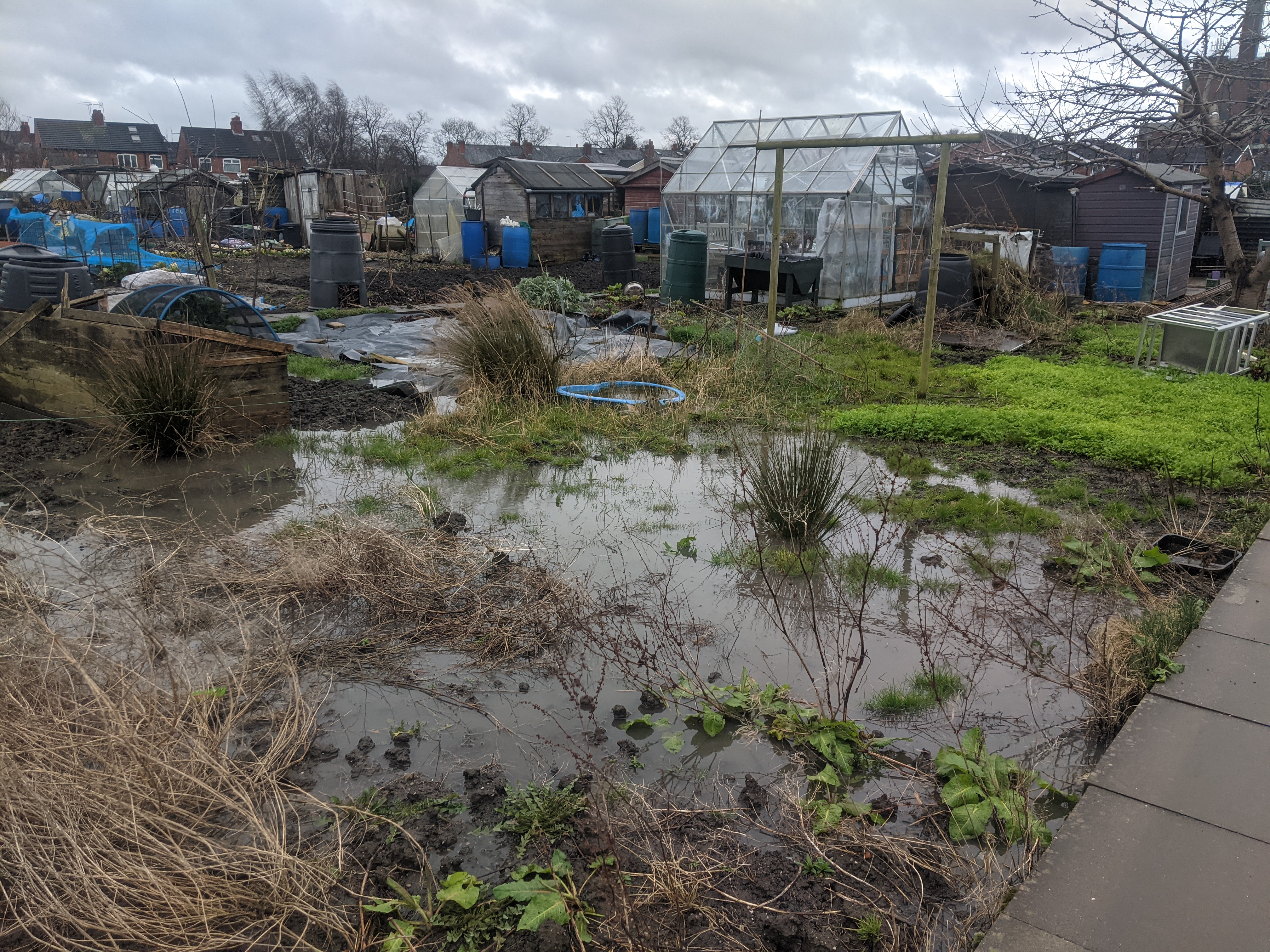 Before I left, I walked around the site to check on how other people’s plots had survived. Apart from a handful of plots being sunk under several inches of water, most plots are intact bar a few blown over pots and chairs.