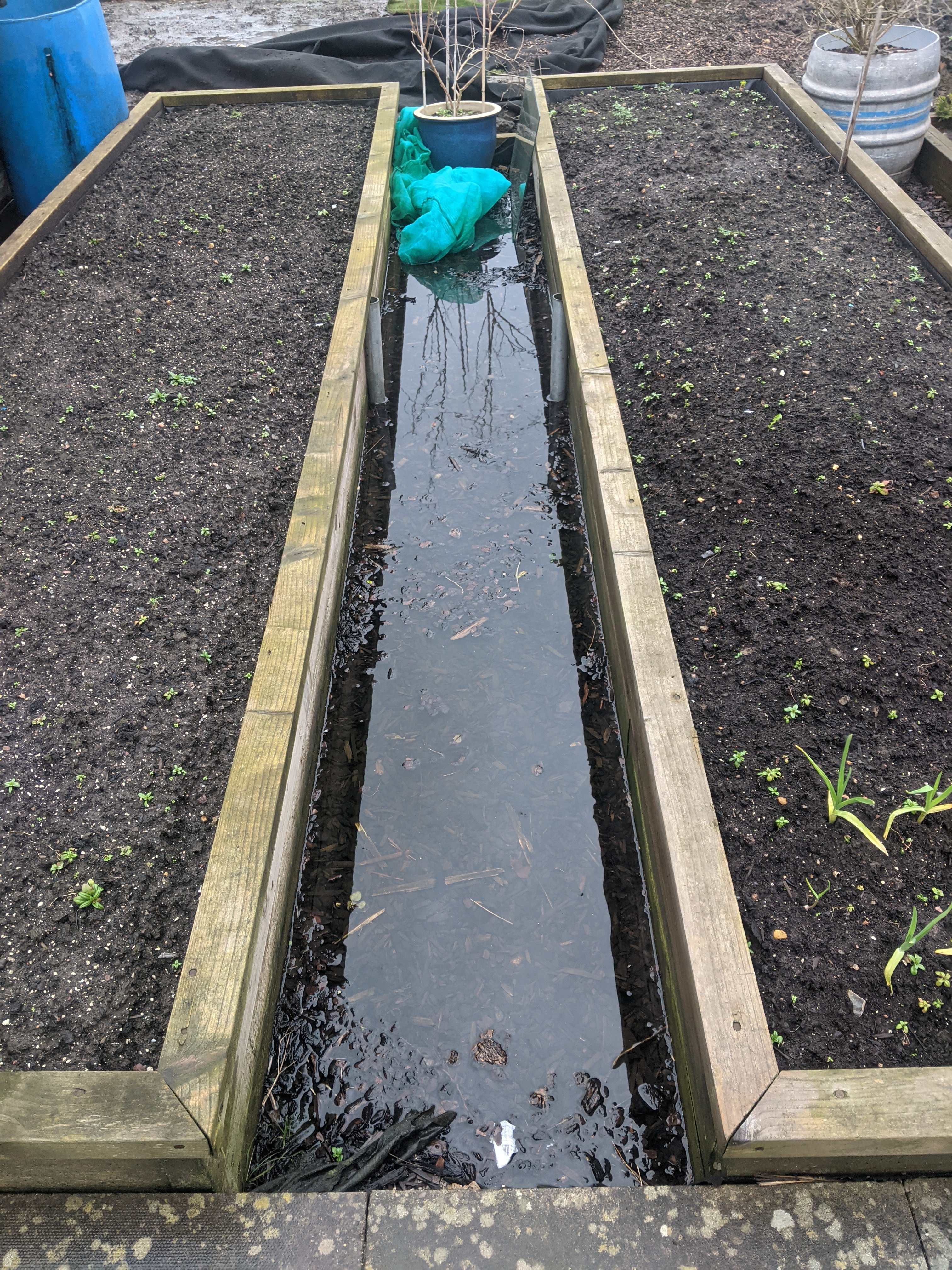 Both yesterday and today have been wet, impressively so with a generous helping of wind. At home, one of our fence panels got blown out, weirdly in one piece which suggests the wind got underneath the panel and pushed it up. The wind dumped it in next door’s garden. When the wind eventually drops, we will put it back. On the plot, we seem to have got away quite lightly. The shed still has a roof and solar panel, the greenhouse is in one piece and all chicken coops are still standing.