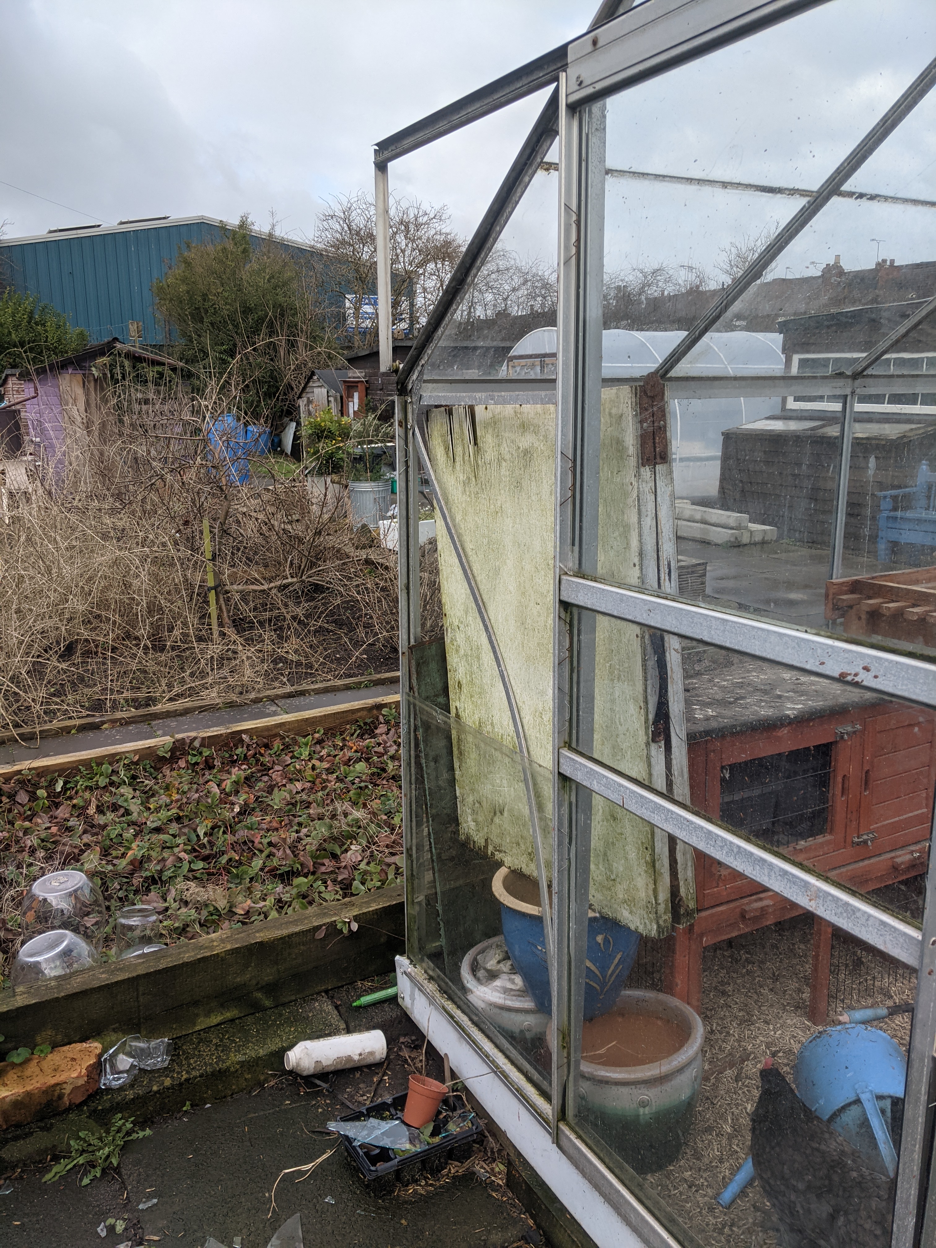 The front of the greenhouse seemed to have faired well enough, with a bonus of the front door still being in place. That bench is worth it’s weight in gold for stopping the door flying off. At the back it was a different story. The patio was covered in broken glass and the greenhouse was missing the middle pane on the side next to the strawberry bed. For good measure, the wind had also blown out the top triangular piece on the opposite side. My first job was to collect as much of the glass as possible and bag it up. The smaller pieces I left to collect tomorrow when I can bring down a pair of thick gloves.