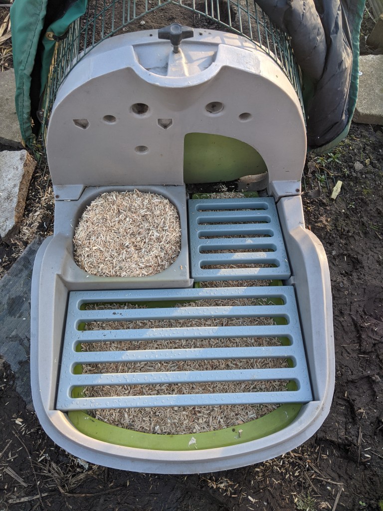 I made sure the Omlet door was shut with the Little Weed Destroyers kept in the run before I began. As I dismantled the nest box and began to clean it, I had a strange feeling of deja vu. Somehow I had a feeling I had done this before! Due to the mud on the allotment, this Omlet took quite a while to clean in comparison, but it looked brilliant when it was finished. Fortunately, the sun was still out so everything dried really quickly. I threw in the perches, some bedding and reassembled it just as my back began to complain about being bent over for such a long time! Typically, not one of the Little Weed Destroyers showed any interest in their clean nest box. Grumbling under my breath about “ungrateful birds”, I took out their food and water bowls. I pottered off to clean the water bowl and refilled it, pleased at my hard work. When I came back however, I discovered to my horror that Roxy, ever a wily bird, had managed to sneak out of the run door, taking Trixie and Foxy with her!