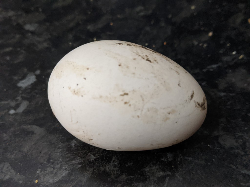 This morning, something incredible happened in the new coop. We had no idea that something momentous had happened until my husband came back from the allotment carrying it. As he put away the morning’s haul of eggs, he pointed out a small white-ish egg. He had found it in the nest box in the new coop, laid next to Leia’s usual offering. Could it be?!