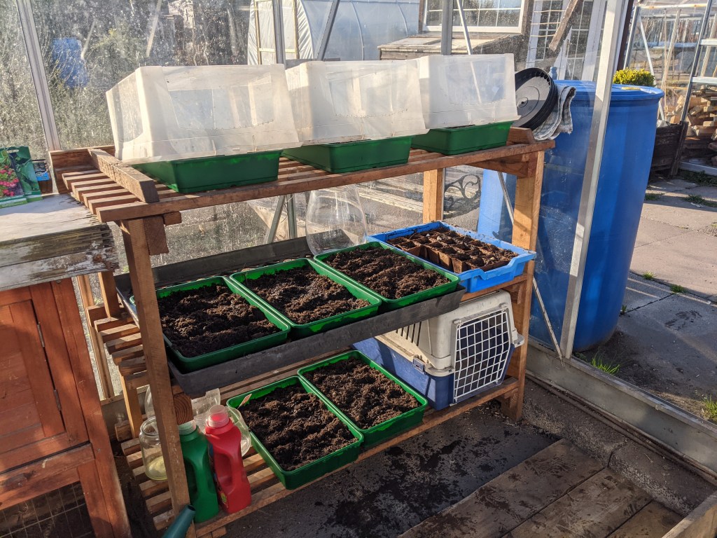 Leaving my husband to deal with the new coop, I finished off the greenhouse quickly. Shortly afterwards, he joined me in the greenhouse to start planting. This is one of the most exciting parts of the allotment year. We had bought eight new seed trays and filled them with compost. I tend to buy lots of seeds in the spring and my husband chose his favourites to plant first. He even had his own tray for three different types of chillies (hot, hotter and surface of the sun!). It was so lovely to stand in the greenhouse together, planting our crops for the season. Between us we planted chillies, cauliflower, broccoli, butternut squash, pumpkins, uchiki kuri squash, sweet peppers, a selection of French beans, broad beans, different kales, garlic, tomatoes and aubergines. In the unlikely event that they all grow then we will have a bumper harvest! There are still a few more seeds that need planting which I will do tomorrow.