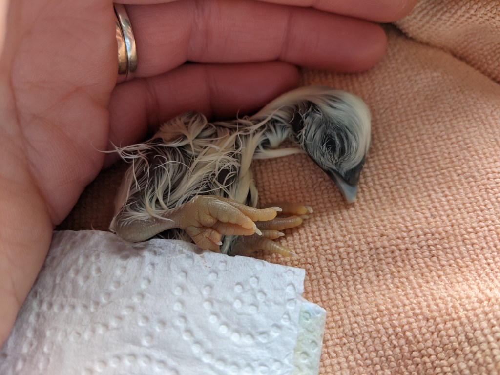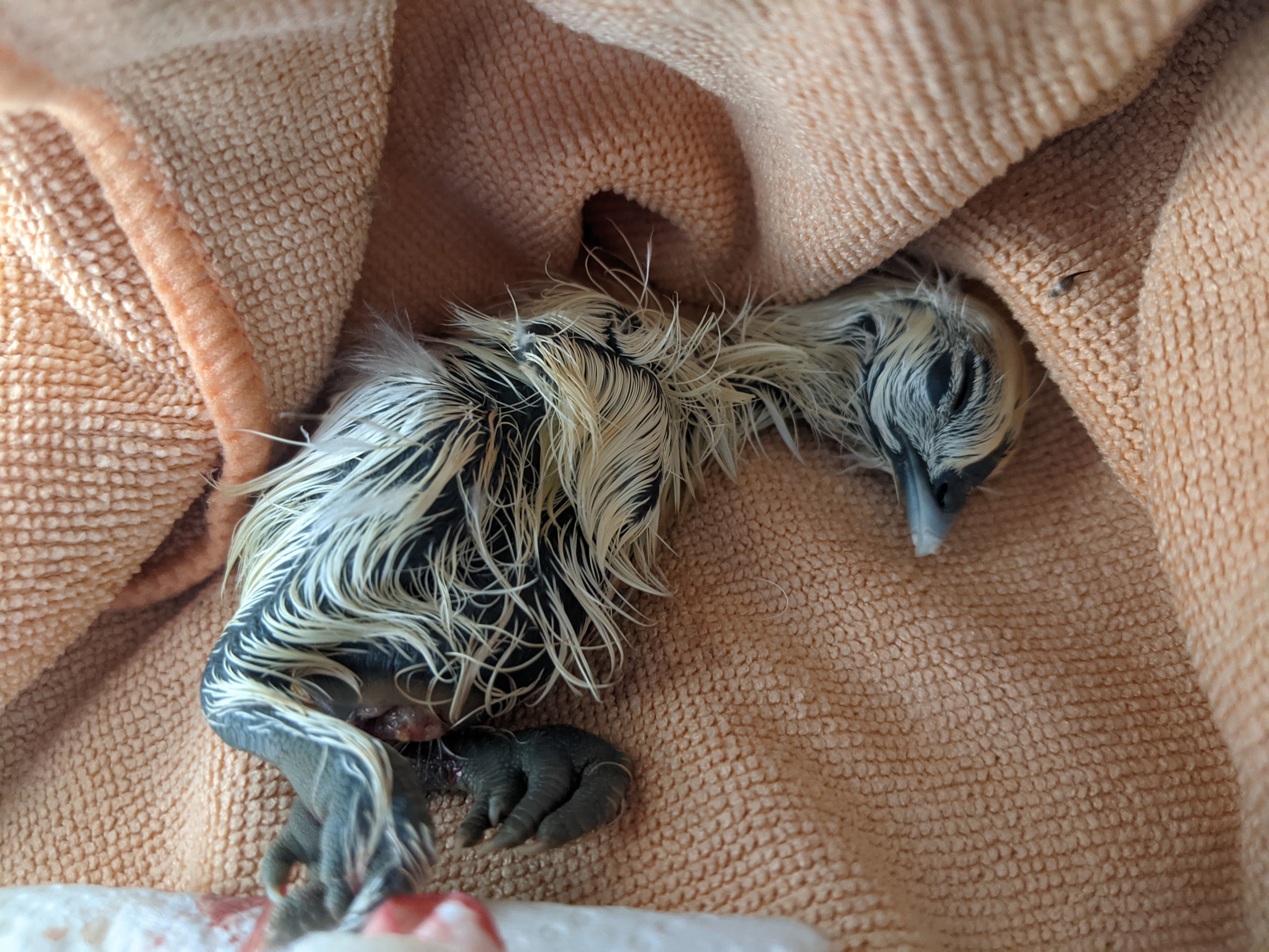 It seemed unlikely that such a small egg would have anything in it. We were completely wrong! Crammed inside was a tiny bit perfectly formed chick. Due to its size and the fact that I could see it hadn’t fully absorbed the yolk, I suspected this chick wouldn’t survive. I tried my best but within half an hour, it had died.
