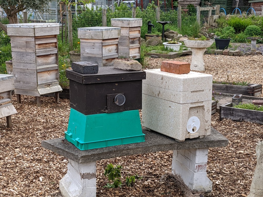 Having seen that Phil and Steve had used both polystyrene hives catching two more swarms. All that was left in the bee shed was the wooden swarm box Steve made several years ago. Slowly, I put the swarm box underneath the branch, balancing it on a pallet Bob uses as a lid for the compost bin. Next was the scary bit. Reaching up, I held the branch, took a deep breath and gave the branch a huge shake. The swarm dropped into the box with a surprising thud which was immediately followed by an incredibly angry buzz. There’s nothing like that noise to send shivers down your spine, even if you are completely safe in your bee suit!