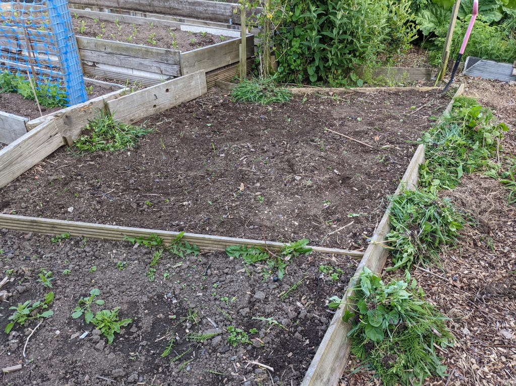 After being away for a week, I discovered that the weeds had made good inroads into colonising the plot. It’s incredible how fast they grow especially with rain and sunshine. Despite it being a busy day at work, I dashed down to the allotment as soon as I could to try and clear some of the jungle. I have to admit, it was a bit overwhelming and I spent several minutes walking up and down the plot trying to figure out where to start.