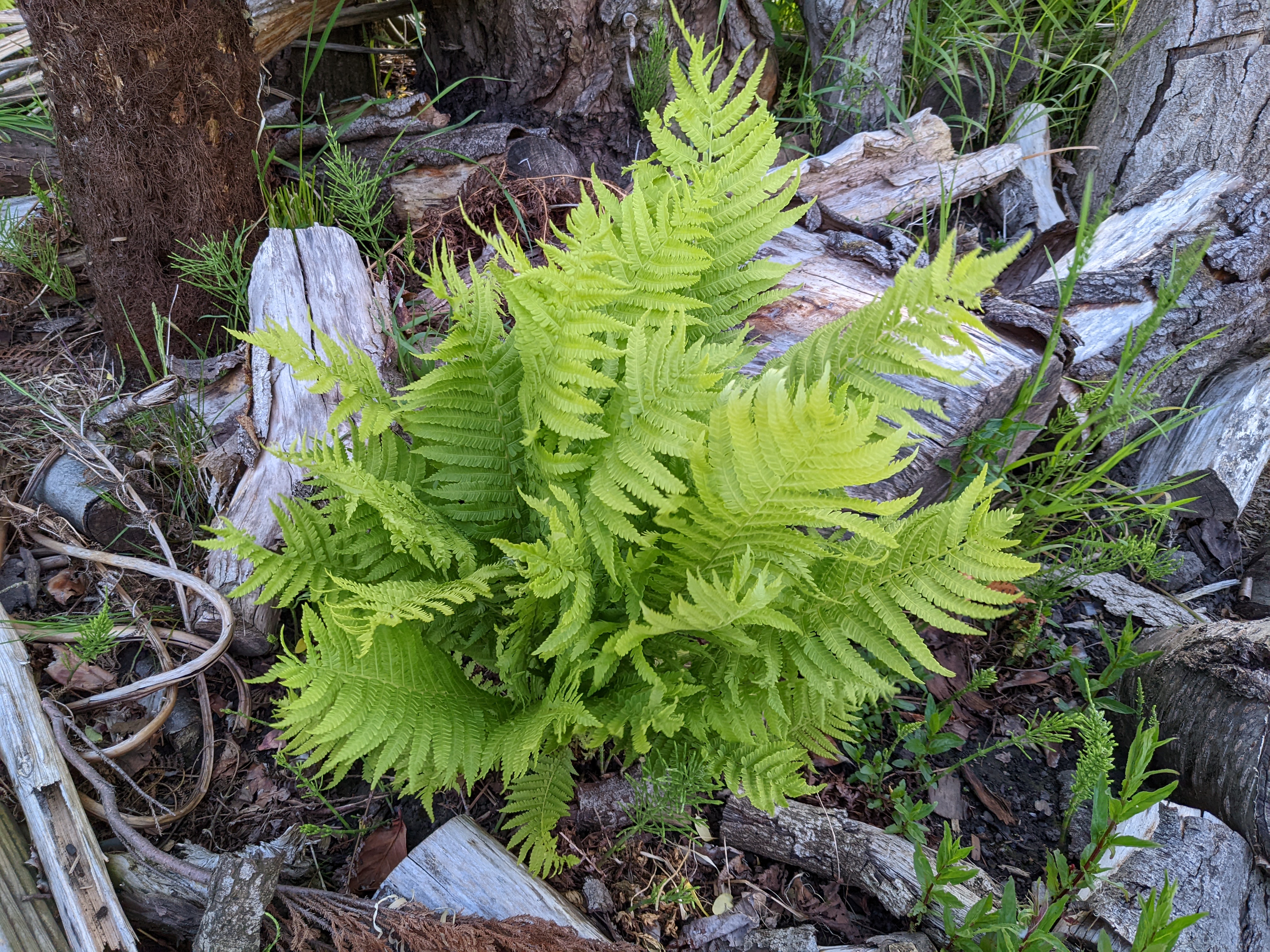Turning to survey the plot, I realised I had forgotten to unwrap the tree fern. As per last year, it had burst out of its cover, proudly announcing its arrival by throwing out three massive green fronds. Mere minutes later, it was unwrapped and I stood back to admire the stumpery. After two years, it definitely could do with some more logs and ferns. But I was amazed to discover that the Japanese fern I thought had drowned over the last two winters had one large frond visible. Maybe this year will be the year it establishes properly. Ideally, it would be great to get some smaller ferns and plant them in the larger logs. But that’s a project for another time!