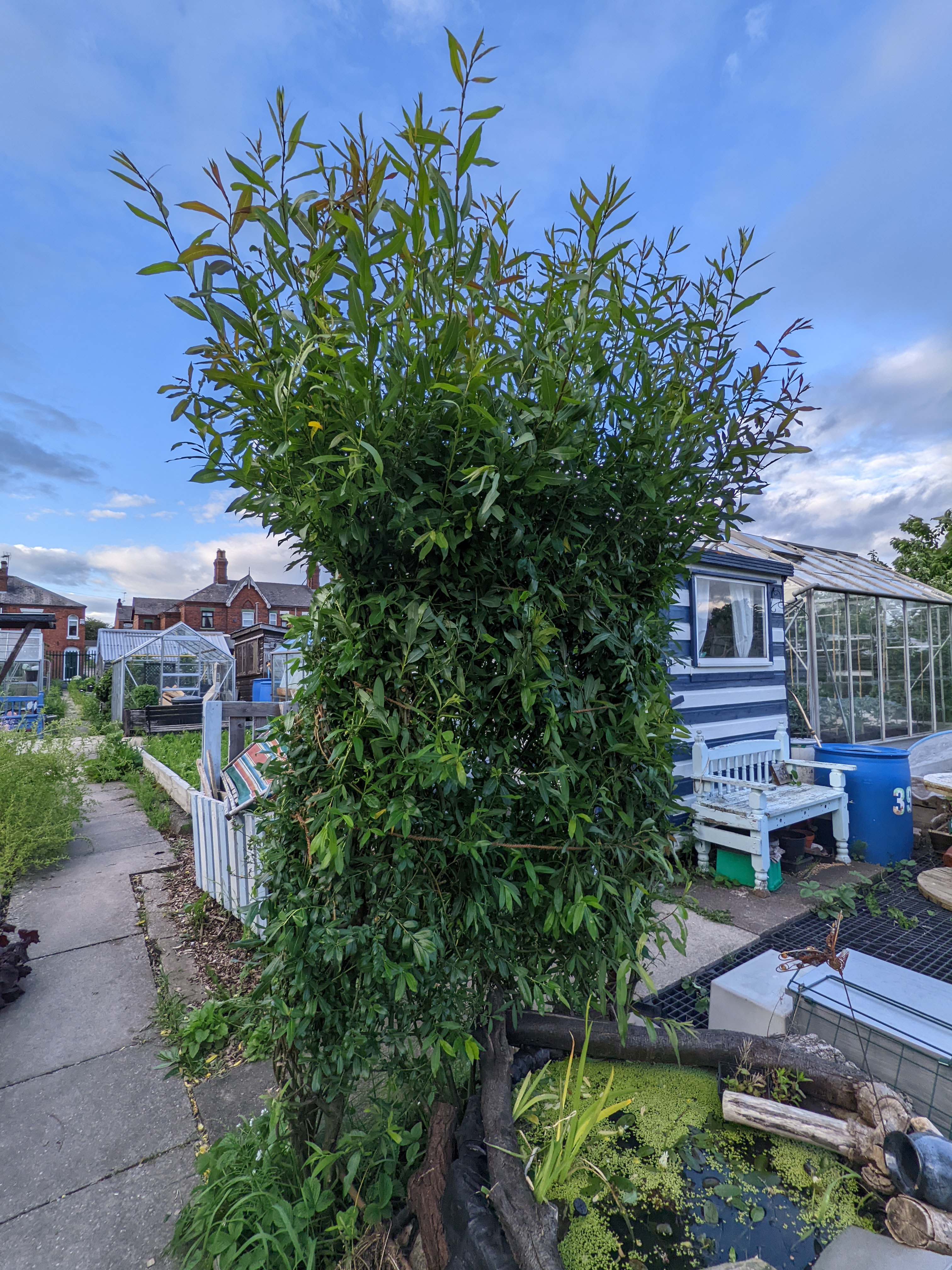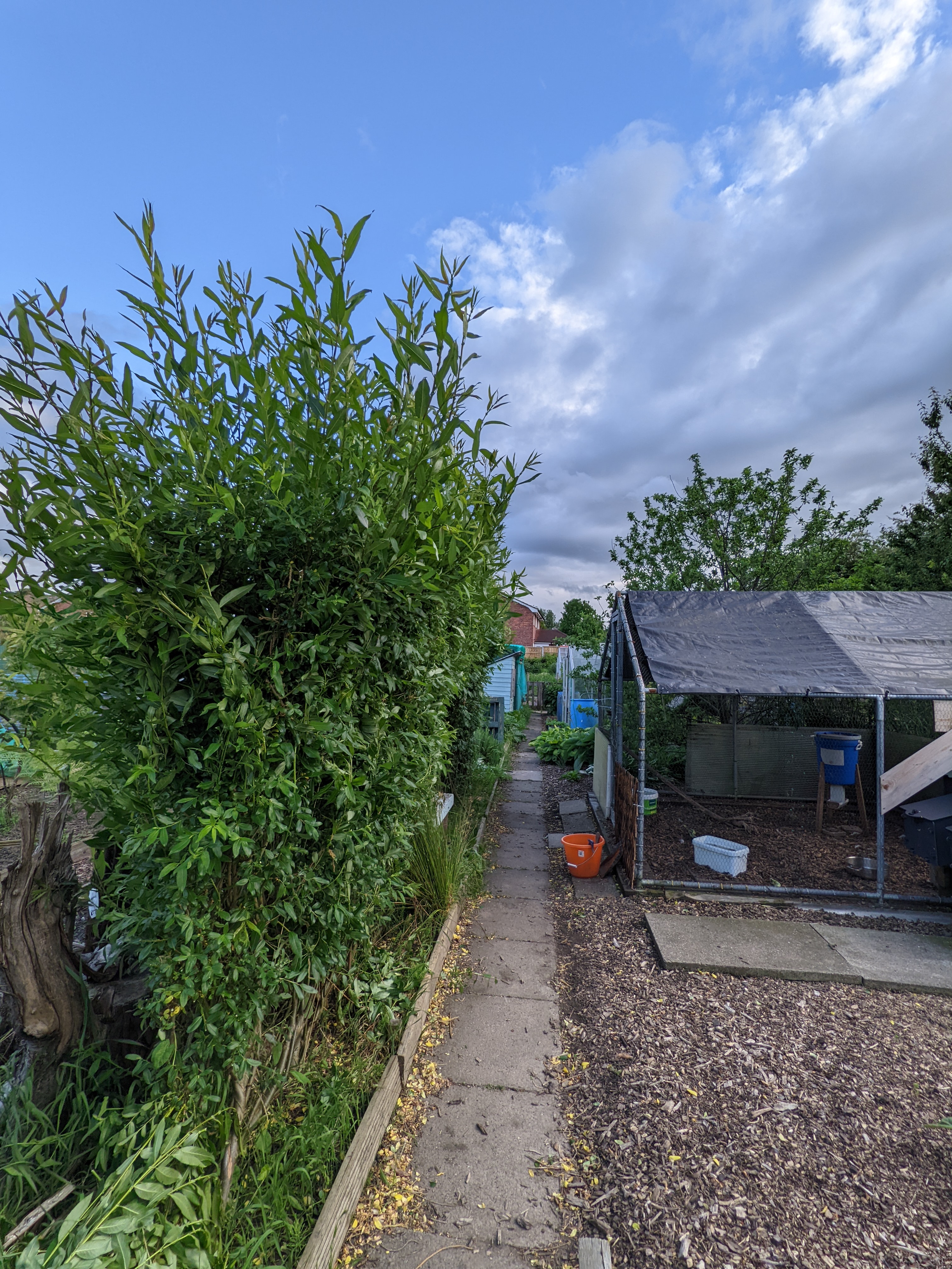 Noticing the secateurs in the shed, I decided to trim the willow. Now although this wasn’t technically weeding, it is essential to keep it under control. Several times a year I hack swathes off the willow only for it to regrow at twice the speed. An hour of hacking at it and the willow screen and the path side of the willow arch were done. I decided to leave the plot side of the willow arch for another day.