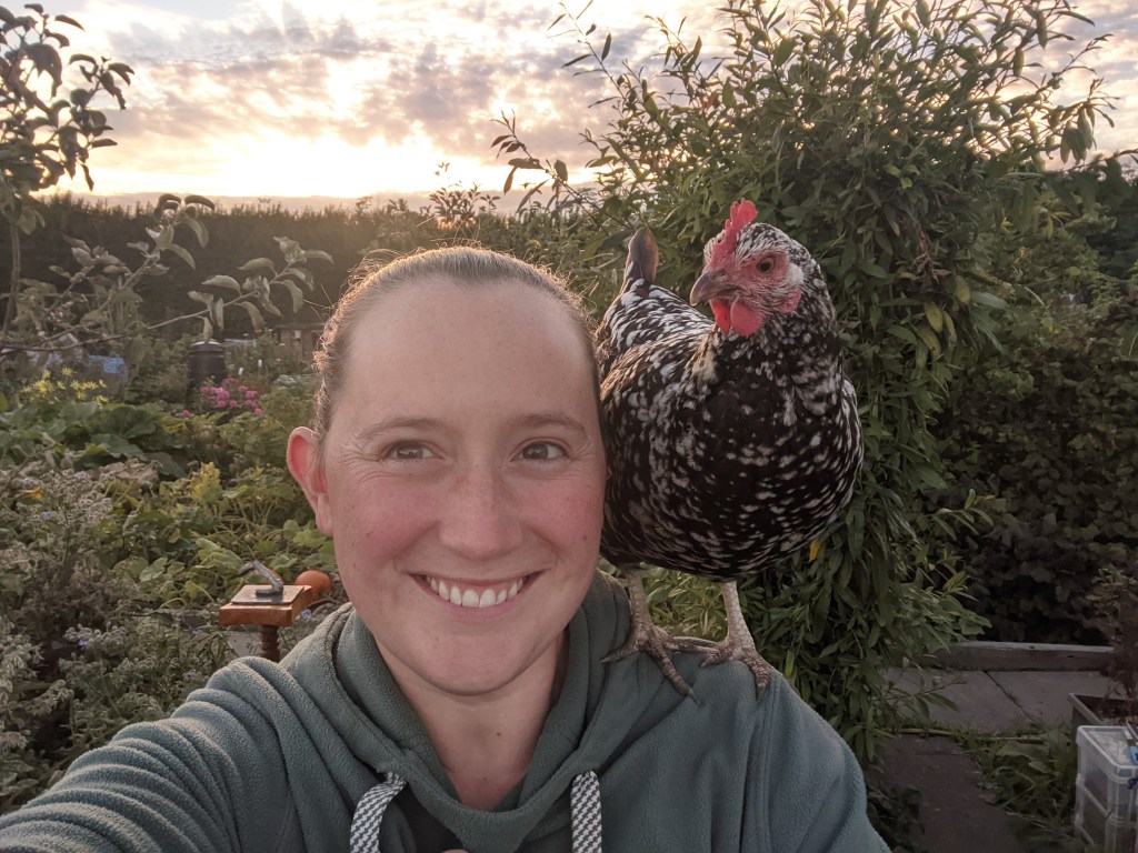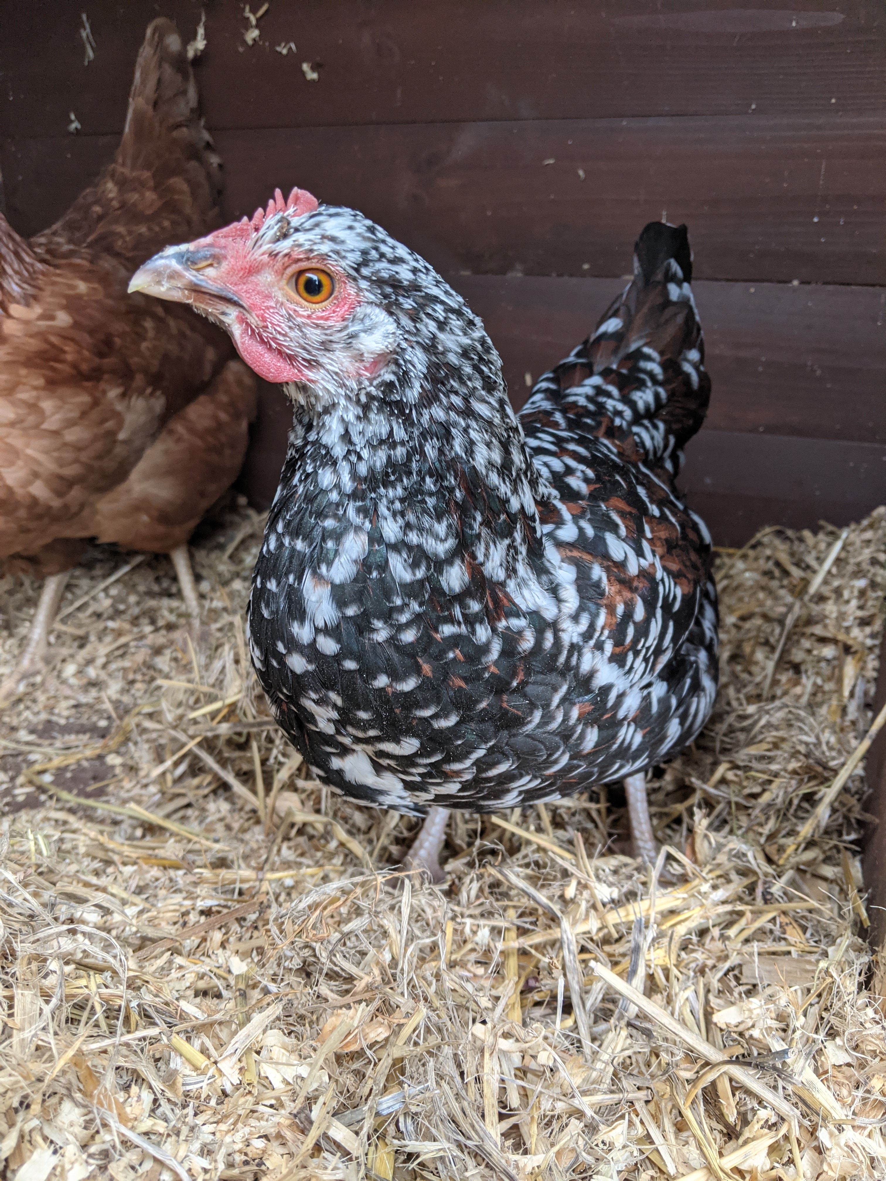 Roxy was abandoned at the allotment gate with two other hens during the first Flockdown. Thanks to Cliff’s quick action, he managed to save all three of them and we kept them in a small isolation coop until we were certain they were free from disease. I took Roxy as the Warrens were picking on her. Rapidly, I discovered she was incredibly tame and loved sitting on my shoulder.