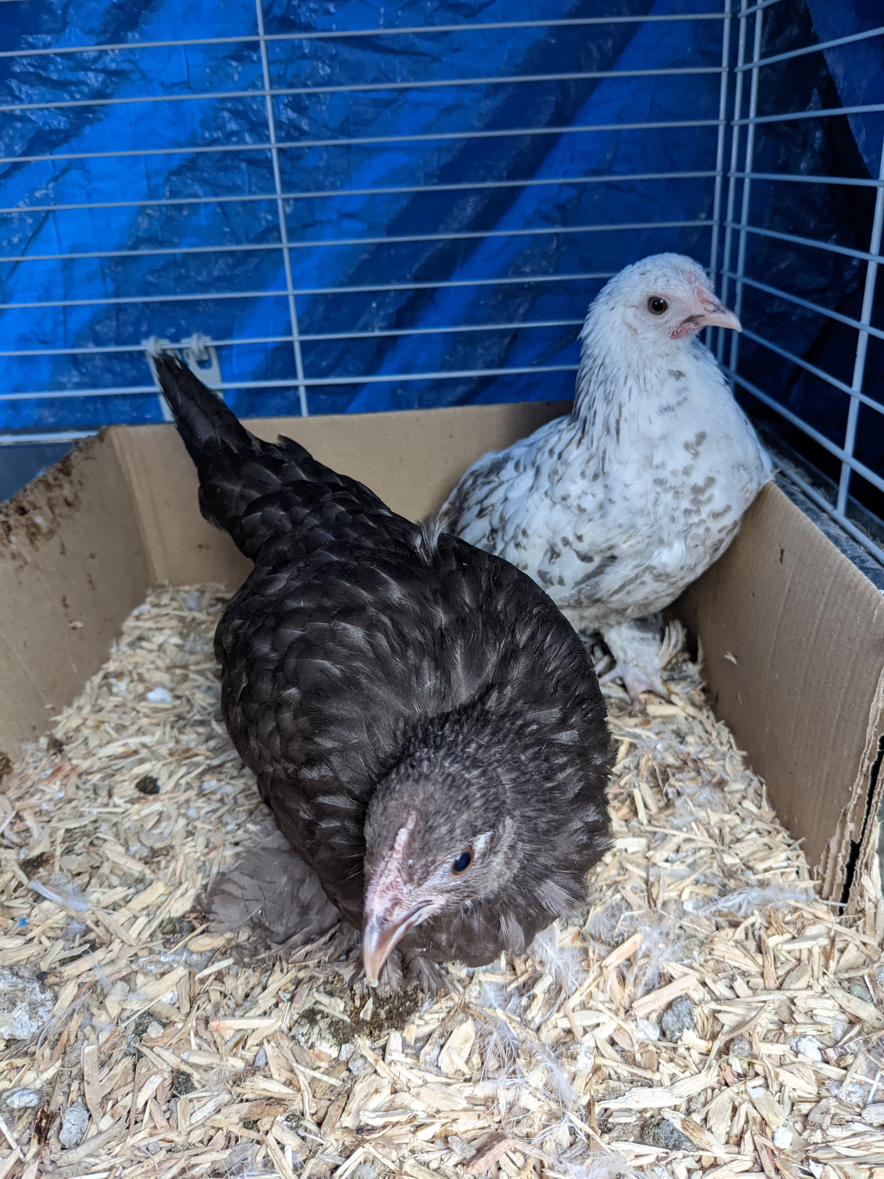 With the boys moving on, the flock dynamic will change significantly. While we still have the boys, who referee wonderfully, I will be playing musical chickens again. Two of Gordon’s girls will be rehomed with Dylan and his family as well as the female Silkie chicks when they are a little older. That just leaves Foxy and the Littlest Bantam in the New Coop. Even when Trixie’s leg is better, the three of them would rattle around the coop. So the only solution was to get hold of a local breeder and see if he had any girls. Happily, he did! I arranged to pick them up today.