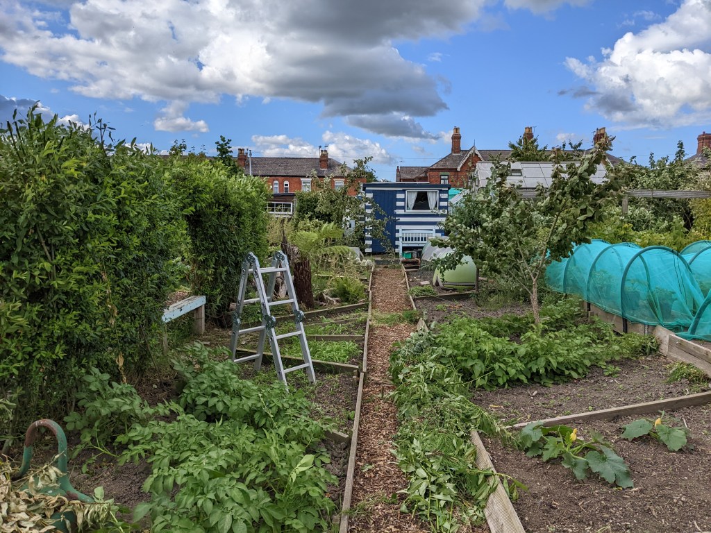 During the first torrential shower of the afternoon, we headed down to the plot to tackle the wall of weeds. We sheltered from the rain in the shed, I miserably looked out of the window, worried that we wouldn’t be able to do anything. Fortunately, the rain stopped and we dashed outside. As my husband worked on clearing the weeds around the Omlet, I grabbed the secateurs and the ladder to finish off taming the willow arch. Several days ago, I had hacked the willow back from the path and begun to prune the top. But I had ran out of time to sort the plot side of the willow. It took quite a while to go especially the area behind the stumpery. The top of the willow may not be entirely level, but it’s the first year it looks perfect, with no gaps or thin patches.