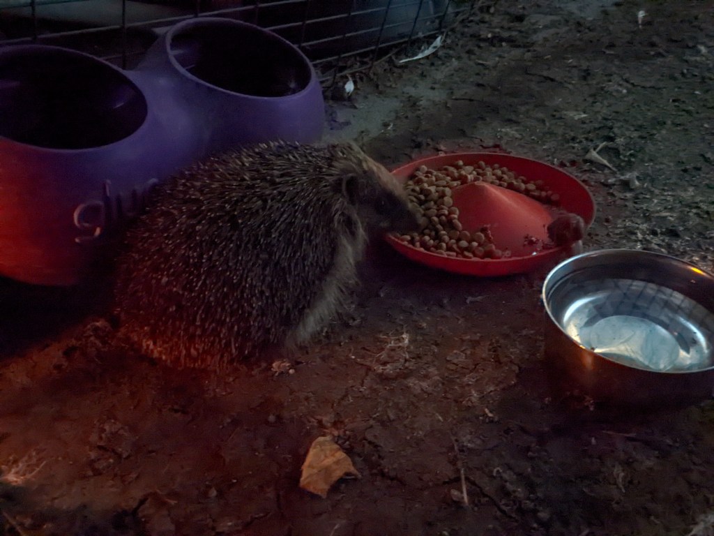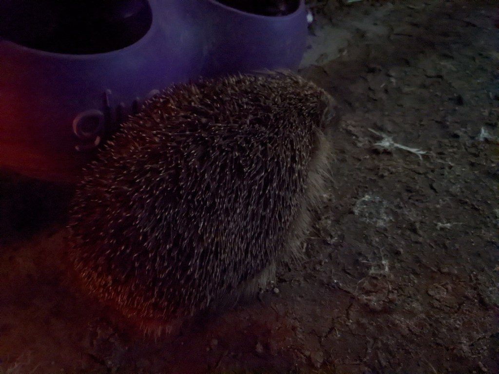 Just as I was about to put Winnie back in her overnight carrier, my husband shouted from the back of the house. Clutching Winnie to my chest, I dashed out to see what was the matter. I found my husband on the patio with big smile on his face. “Look in the Omlet!” he said pointing. I peered around the side of the kitchen to see a huddled lump against the Glug drinker. It moved slightly and made some loud snuffling sounds. It took me a few seconds to work out what it was, but then a memory from several years ago flashed through my mind. Another evening the garden had a spiky visitor who made the same noises and polished off a bowl of cat food before bumbling off down the garden. I edged closer and my husband turned on a torch.