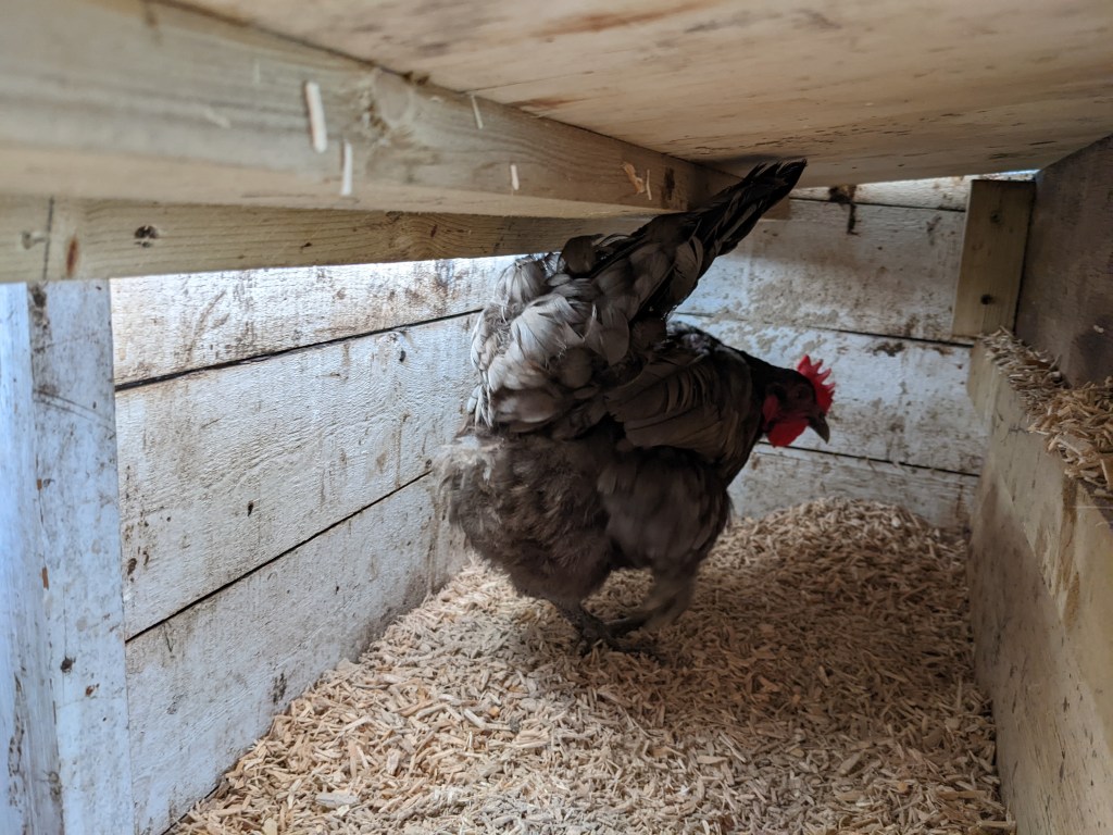 Before I left, I filled the laying box with fresh bedding. The instant I removed the baracade, Flora appeared to inspect my handiwork. I think I must have just passed muster as she settled in the laying box after throwing around some bedding. I left her to it with instructions to lay me an egg. I can’t be sure but I thought I heard a rather rude retort as I turned away…