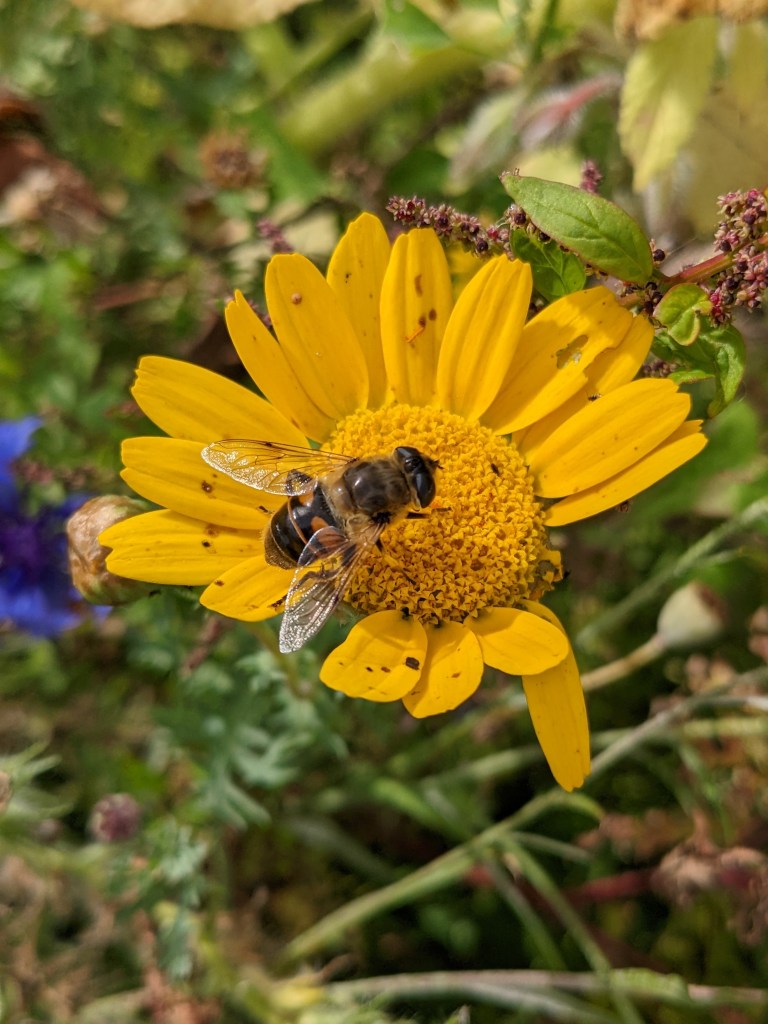 I moved across to the bed between the Bog Garden (currently an ironic name!) and the sunburst wildflower beds. Here I rediscovered a couple of rows of potatoes. These ones seemed to have faired better and although there were fewer, they were a much better size. I wondered whether I should weed between the wildflowers but decided against it. To do a good job, I would inevitably pull out some of the flowers or squash them as I weeded.