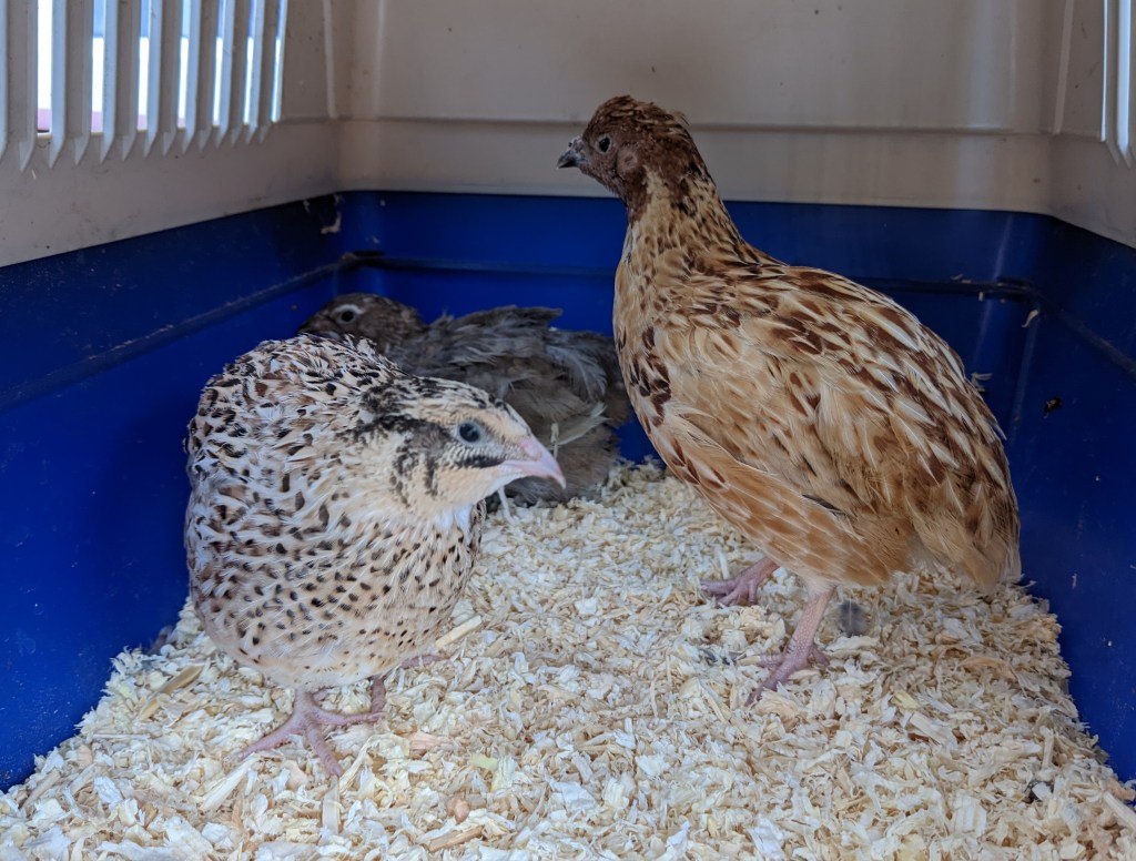 We drove across to Williston with our little feathery friend in his carrier. He didn’t like the car but, in my sleep deprived brain, this seemed a fitting response to being rudely awoken by a belligerent quail for the last few days. The breeder was a young chap who told me he would have more females available in the next couple of weeks. Ideally, our little man should have between 2-5 girls so I said I would keep in touch and be back once the chicks were old enough to be sexed. The two female quails have very different colourings which surprised me. One was a beautiful pastel grey which is stunning.