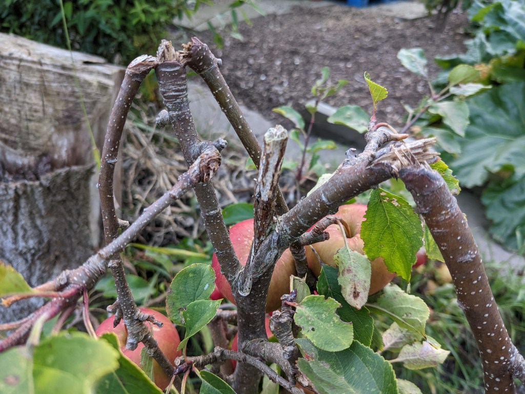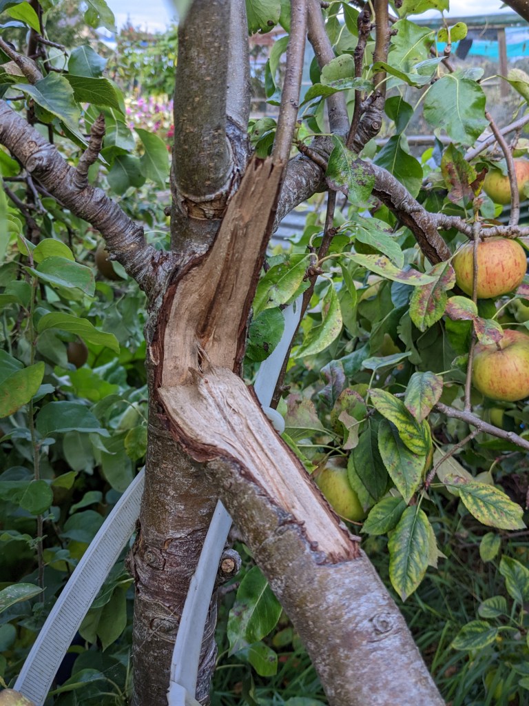 The Braeburn tree at the bottom of the plot has outdone itself. There are more apples than leaves! My main problem with this tree is its height. I will definitely need a ladder to pick the apples on the top half of the tree thanks to being the height of the average adolescent hobbit. Upon closer inspection, I found that one of the thickest branches had snapped and was hanging by a thread. I spent a few minutes pondering whether I might be able to jump and reach it to pull it down. Then remembered what a ridiculous spectacle it would be and decided to leave it for when there was no one to witness the inevitable disaster that would follow…