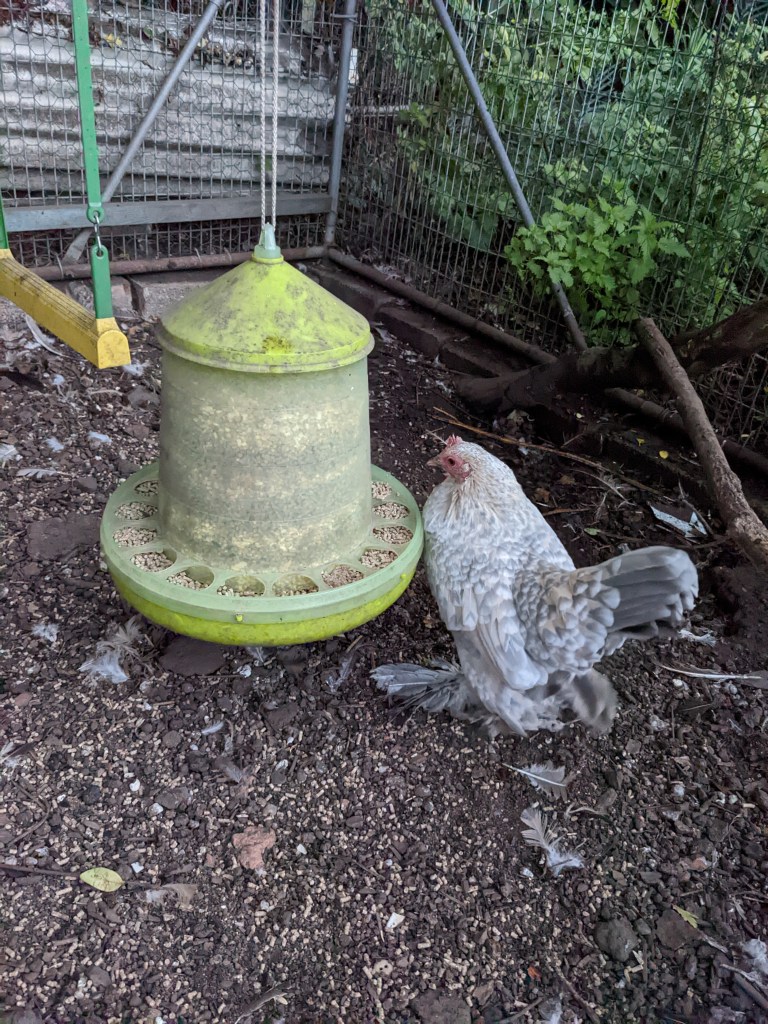 Over in the Main Coop, I was greeted by Flora. Always keen to be the first at the treats which usually ends up with me regularly tripping over the idiotic bird as she weaves between my legs like a cat waiting impatiently for it’s dinner. I managed to stay upright for long enough to throw out the treats before Flora deserted me for food. Both Rey and Polly have also regrown their feathers and it’s hard to tell which of them is tip chicken at the moment. Poor Dora spends most of her time at the periphery of the group, waiting until the others get bored and wander off before getting stuck into the treats.