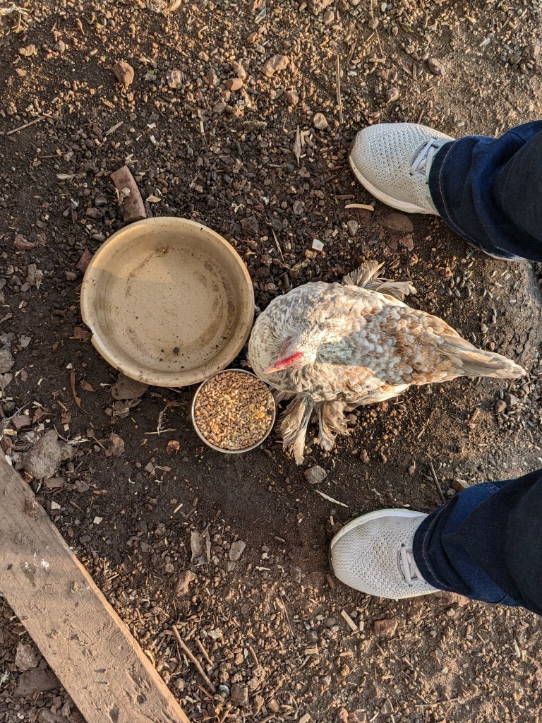 When I walked into the coop, I spotted that she had squashed herself between the side of the coop and the base of the perch. Guessing that someone has pushed her off, I picked her up and put her in front of the water bowl. She stayed stock still and refused to move. Rolling my eyes, I picked her up and tipped her forward slightly so her beak touched the water. Once she had her first taste, she happily began drinking although with only one working eye, her depth perception was a little lacking.