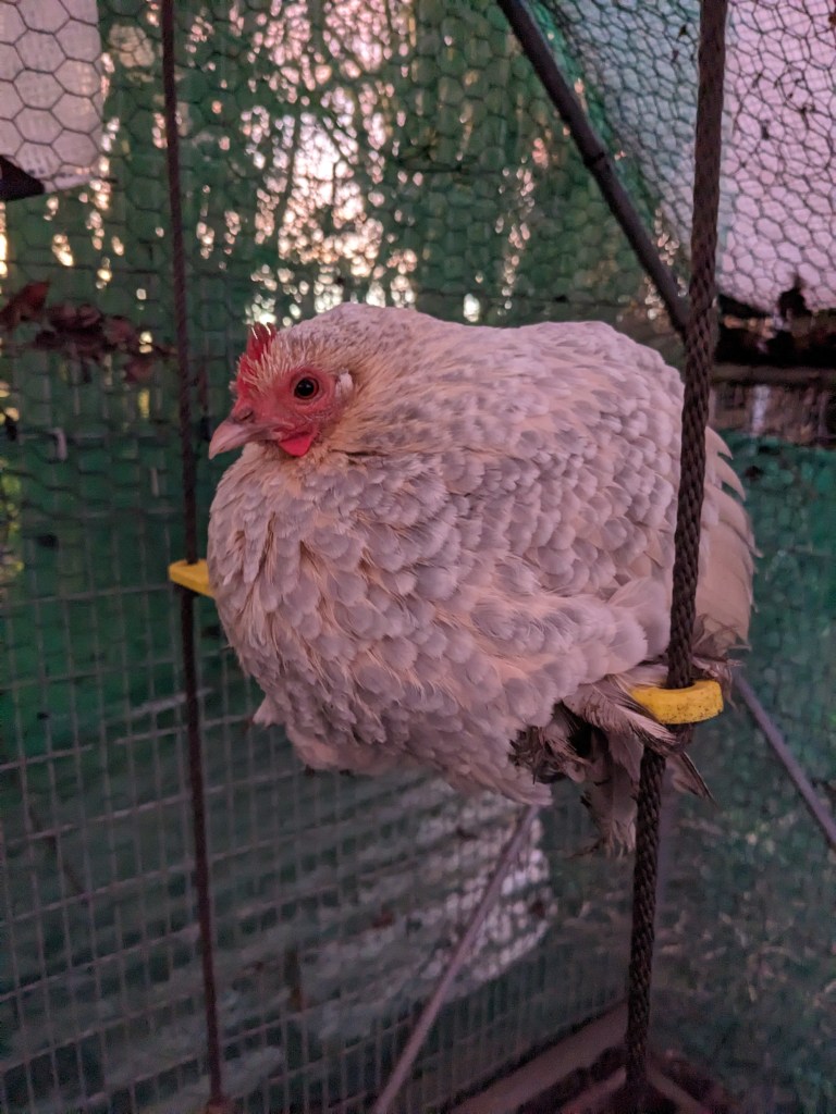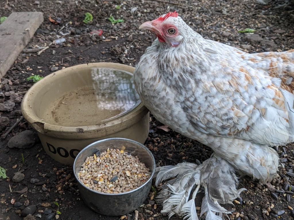 Shrugging off my frustration, I walked across to the plot. Maude and Mavis were already in their nest box as were the Big Four in the Main Coop. With everyone in bed, I looked into the New Coop. Aside from Gertie, they were all standing together underneath the perch. As soon as I walked in and changed the water, Gertie woke up and began shuffling around on the perch. By the time I had filled up the little food bowl, she was positively bouncing with excitement. I picked her up and she immediately began to peck at my hand like shed never seen food before.
