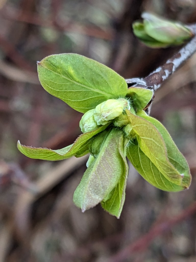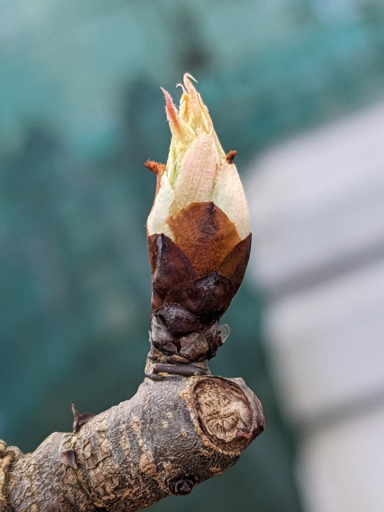 With the cherry blossom appearing, I walked around the site, looking closely for signs of spring. To my delight I found that some of my fruit trees were in the early stages of throwing out buds and some of the fruit bushes had flashes of green.