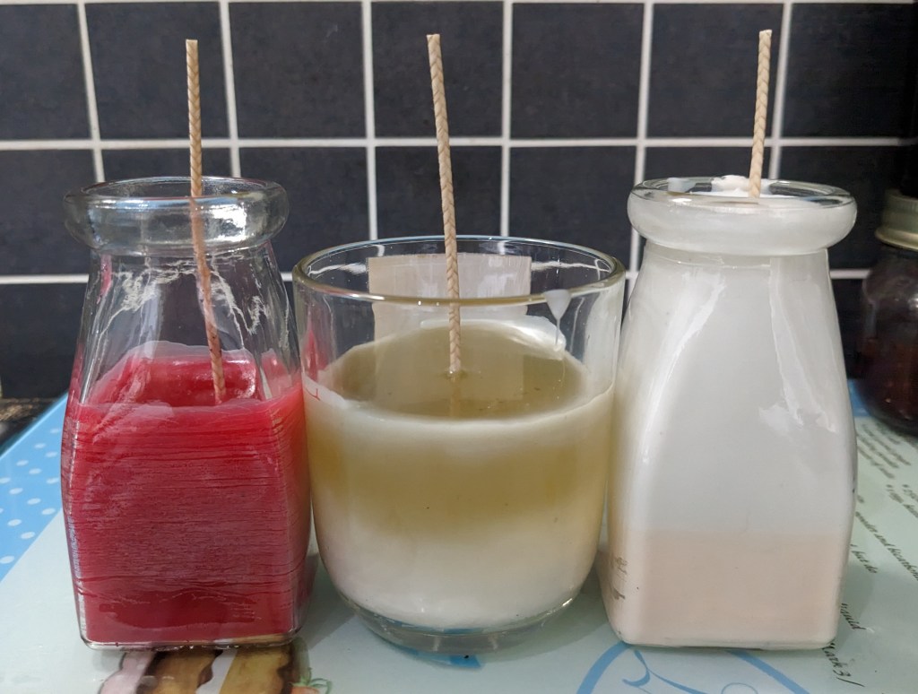 Suddenly, I had a new candle! To help it cool quicker, I partially filled a mug with cold water and put the candle in. Within a few minutes, the wax had cooled enough to be touchable. Inspired with my success, I proceeded to round up a couple of old candles we used in the blackout a few weeks ago and marched back to the kitchen. My husband seeing that the kitchen would soon become an industrial candle making zone, beat a hasty retreat and disappeared upstairs. Over the next half hour, I had a great time experimenting with different waxes and generally making rather a mess of the kitchen. However, amid all the chaos, I managed to make three small candles.