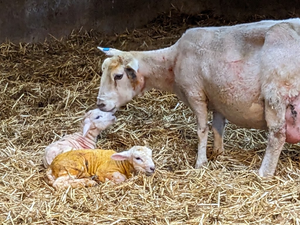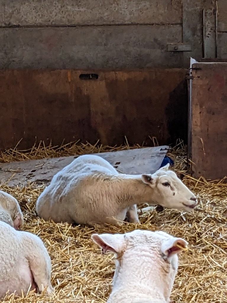 Later, we made our way across to the last barn where all of the ewes were expecting twins. Slowly, we inched forward to get a better view. We spotted three ewes who had recently delivered their lambs. Extremely wobbly and all leggy, they tottered after their mothers. Quite how they stand and walk so quickly after being born is beyond me. It takes us almost a year to work out how to make two legs work – imagine how long it would take us to work out four!