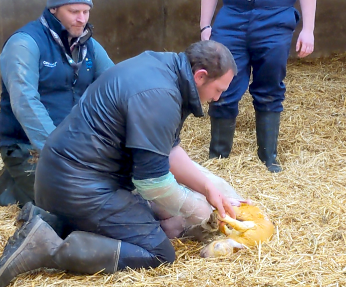 We moved on, following the crowd around to the lambing unit. There were three massive barns, each split into different sections according to the type of pregnancy (single, twin, triplet) or the age of the foster lambs. The first barn we went into had ewes expecting single lambs or triplets. The ewes expecting triplets looked like they were going to explode! Their stomachs were so swollen! We watched them for a while, carefully looking out for signs of labour. Apparently, there are three distinct phases of a ewe’s labour. We saw some evidence of stage one, restlessness and nesting but nothing much else.