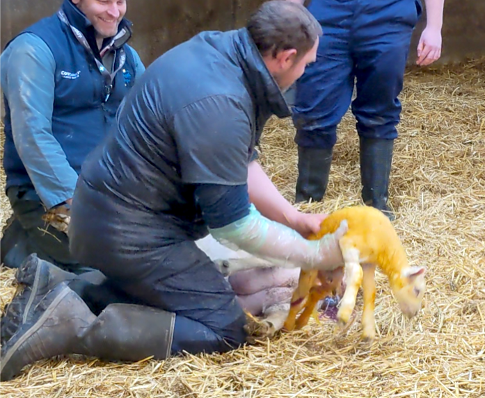 At the back of the pen, I spotted a ewe baaing loudly. She seemed very restless and kept sitting down and standing up. After a few minutes, we spotted her waters going. Something was happening! Fifteen minutes later, we could see a hoof. But as we watched and wondered, several staff appeared to check on her. Lots of discussions were held and eventually, they decided to intervene. Two of the staff herded the other sheep away and the third managed to catch the ewe. He gently brought the ewe down to the ground and armed with a very long-sleeved medical glove, managed to carefully manipulate the lamb into the correct birthing position (both front legs and head facing forward). It seemed that the lamb had one front leg further back and this was causing problems for the ewe. Mere seconds after adjusting the lamb’s position, it had been delivered. It looked like a large lamb with a distinct yellow colouring. According to the staff this is due to stress but it will quickly turn back to white as the ewe cleans it.