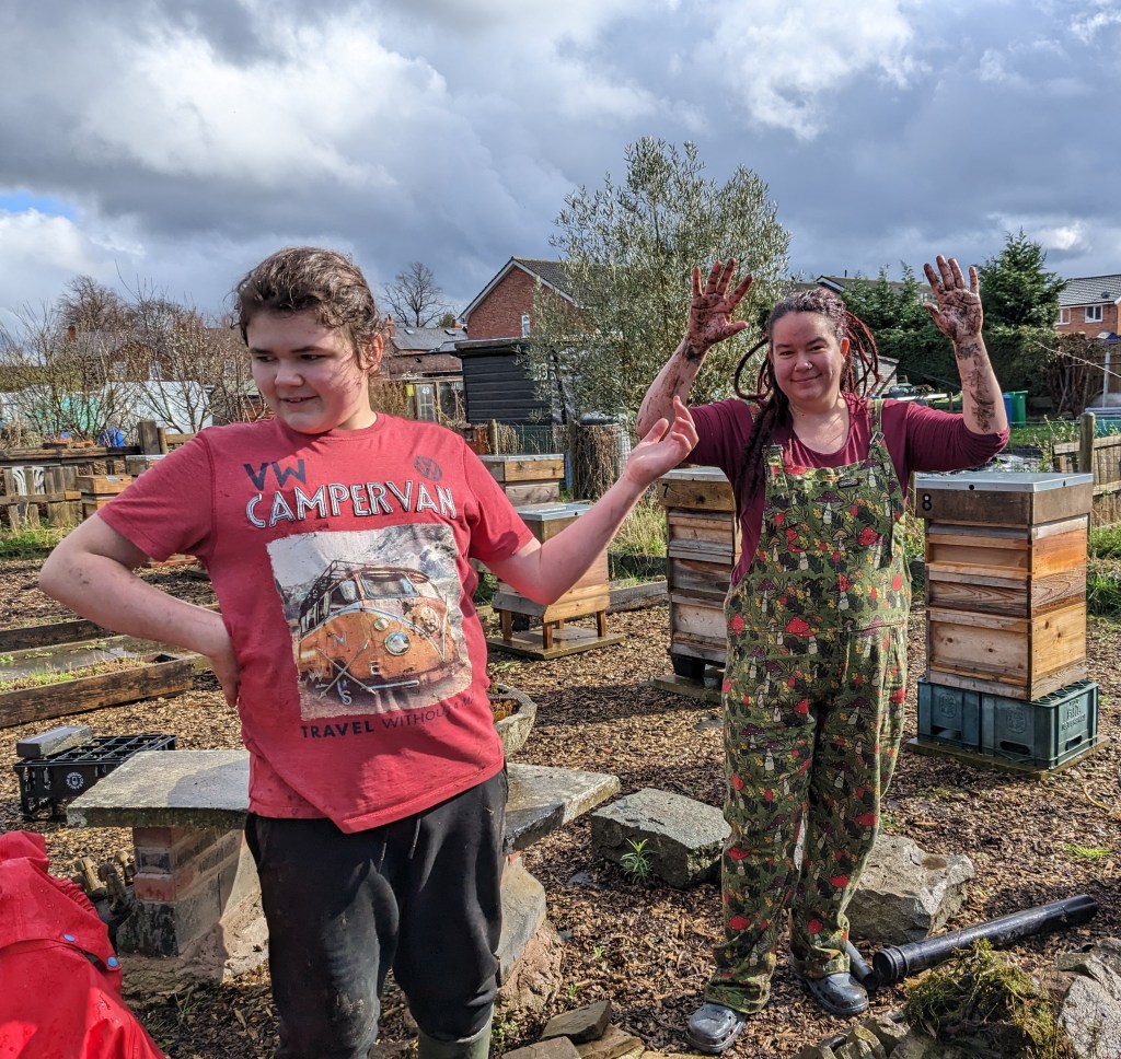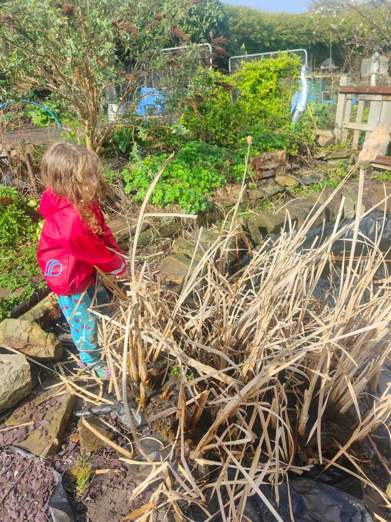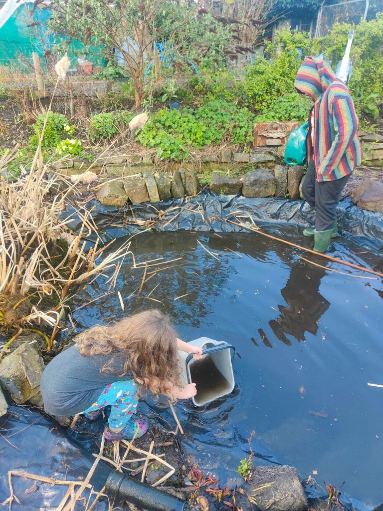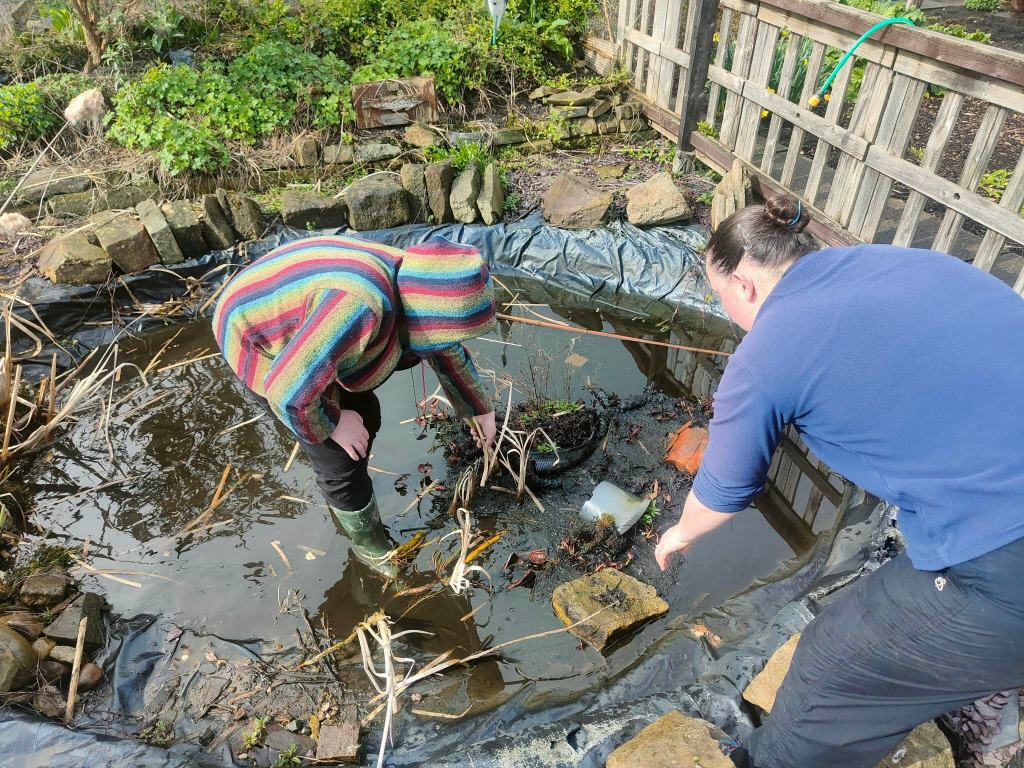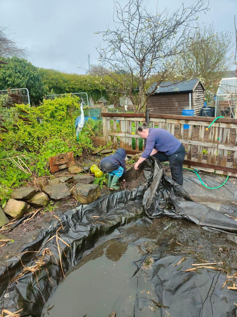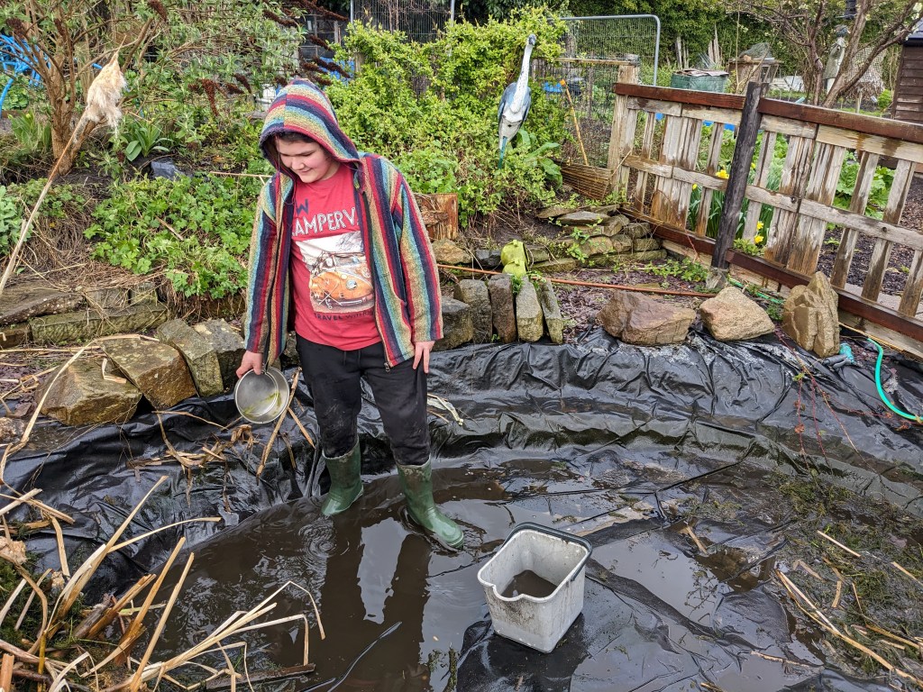 I’m writing this after collapsing at home. Fed up of waiting for others to volunteer to sort out the pond on the Community Garden (over a year and still waiting!), I decided that I had had enough of our hall being cluttered with the pond liner. I messaged Nikki to see if she would be able to come and help, bringing the children with her as extra support. Happily, she agreed and to encourage participation, I offered hot chocolate and biscuits to any volunteers. As it turns out, this ploy was very effective, tempting Dylan and Orin away from their screens and activities at home.