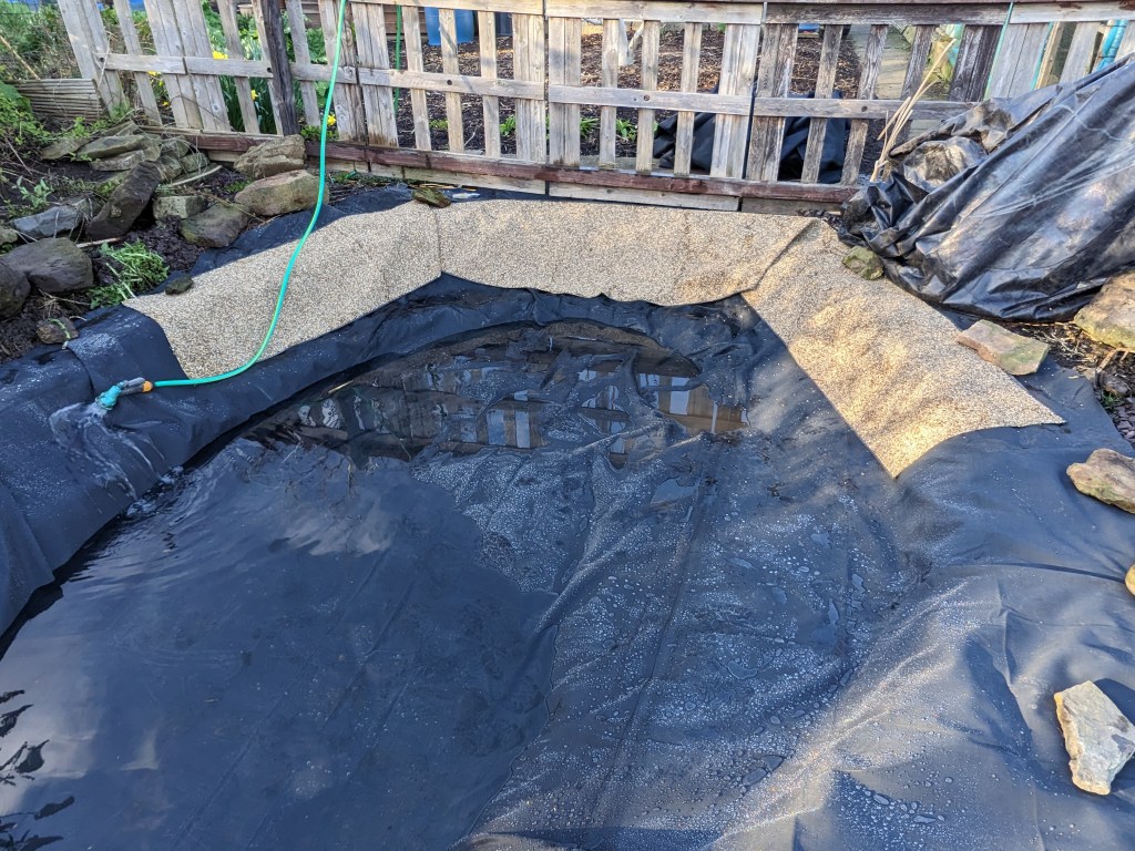 With just two of us left, we started to rebuild the pond. Our first job was to put the underlay into the pond. This thick layer of fabric is important as it protects the liner from sharp or uneven rocks and soil below. The generous folk at Pond Keepers had sent us plenty of underlay. In the end, we only used two of the three but it was more than enough to cover the whole pond with a good margin on the outside. It looked really odd, the grey fabric making the pond look completely different.