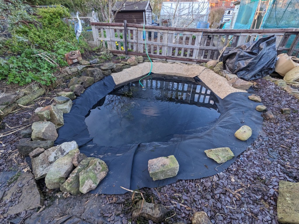 The pond continued to fill, causing the liner to move slightly. Rather than allowing the liner to move at will, I began slowly to build up the rocks around the pond. It’s important to cover all the liner to stop UV damage and to secure it in place whilst the liner settles. I couldn’t quite remember how the rocks were before we started but it didn’t matter. As long as the liner edge was secure, if the rocks looked artistic, that would be a bonus. The light was beginning to fade as I worked along the bank-side of the pond, carefully choosing thin, flat stones to hold the stone liner in place under the fence. By now, I was running short of rocks. But how? There used to be lots of rocks around the entire pond and I certainly hadn’t used them all! I searched around and discovered a pile of them had been neatly stacked on the bee platform. With more rocks, I gradually built up the rocks around the other side of the pond, only finishing when my hands hurt and the light was making shifting rocks somewhat more challenging.