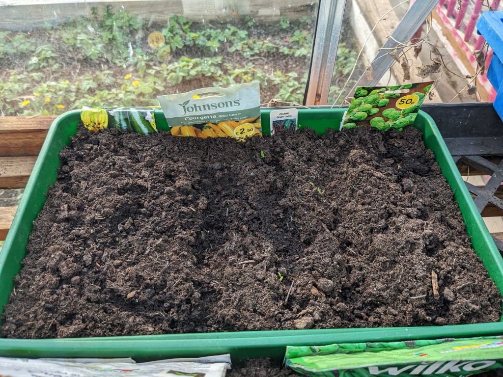 Before we left, I popped into the greenhouse to check on the seedlings. To my surprise, some of them are already coming up! It looks like we are going to be inundated with turnips and chard. The less said about the peas, the better!