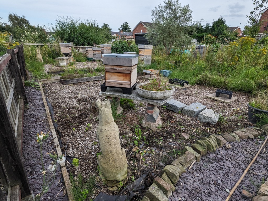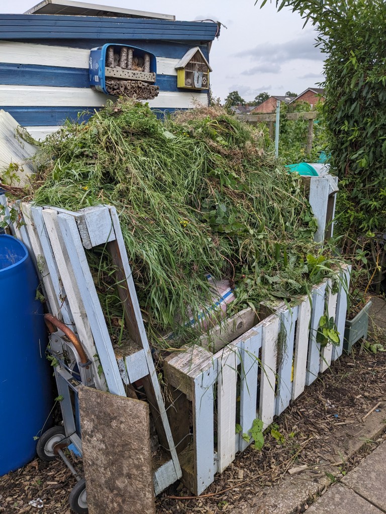 Back to weeding and I cleared all along the sides of the main coop. The back of the main coop is difficult to weed due to the weeds getting caught up in the green bird flu netting. Three weed buckets full later, and I decided to tackle the weeds in the Community Garden. Over the past few months, the garden has become increasingly overgrown. It’s such a lovely place to sit that I wanted to make sure it didn’t disappear under a mountain of bindweed. I began with the right side of the garden, carefully avoiding getting too close to the hive on the bench. It’s strange, weeding is a massive chore at the allotment, but if you keep at it long enough, it becomes quite relaxing. I usually listen to an audio book as I work at the allotment. Sometimes, I can get so lost in the story that when the chapter ends, time has disappeared and a whole section has been weeded.