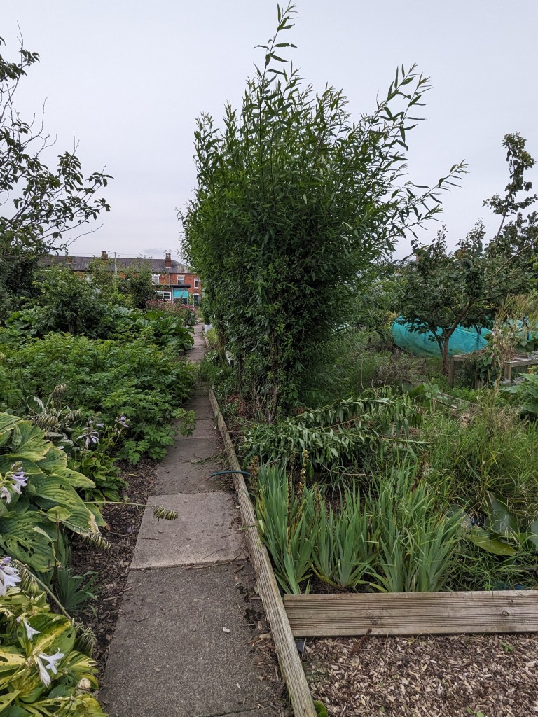 Armed with my trusty weed bucket, I moved onto the weeds along the edge of the plot. I confess to getting bored of pulling weeds partway down so to change things up, I grabbed the secateurs and began the usual hacking at the willow. Knowing how quickly it grows back, I had no hesitation in cutting the willow arch and screen back significantly. This meant the paths were clear allowing you to walk past without feeling like you needed a machete to get through. As I worked, the wind increased so I left the top of the willow for another day.