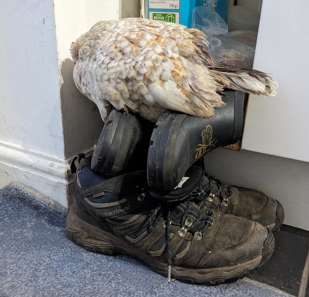 When I arrived home, I found her up and about. She clucked at me as I topped up her bowl. Typically, she managed to overturn the water bowl the second I had finished refilling it with fresh water, flooding the floor. However, I forgave her as she tucked in hungrily to her food. What I was less impressed with was where I found her roosting an hour later. Our outdoor shoes are stacked to one side of the back door. On top of these, snoring away, was the marauding Gertie! The cheek of that animal! Needless to say, I removed her from my outdoor shoes and put her onto her perch.