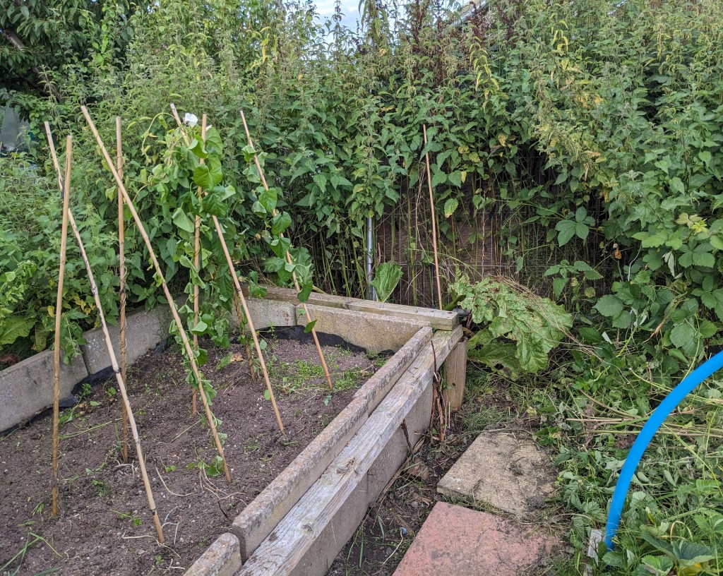 Full of plums, I decided to work on the raised beds on Geoff’s plot that needed urgent attention. I’m particularly conscious about keeping the paths clear to make sure Geoff can walk around the beds without risk of tripping over. Clearing the path along the tallest bed was straightforward until the last few feet. The end of the bed was beginning to be taken over by nettles. A veritable wall of them were growing on the boundary between Geoff and Cliffs plots. They seem to thrive there, catching the sun and growing to well over five foot in height. I approached these nettles with caution, having had to retreat covered in stings the last time I did battle with them. The more careful approach paid off – I pulled out the worst of them! The remaining ones needed full body armour (long sleeve tops, boots and thick trousers and elbow length leather gloves) so I left these for another day.
