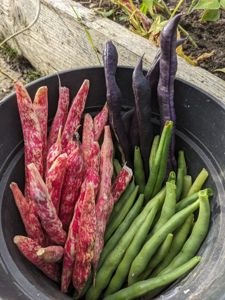 With my mind bent on food, I decided to check how the neglected courgettes were doing. They were massive and much more like marrows than courgettes! However, the chickens adore them, not caring at all what size they are. As I peered through the weeds, I discovered some of the climbing purple beans. There were only a few which were edible, the insects hogging the rest, but it’s the first time I have ever successfully grown some.