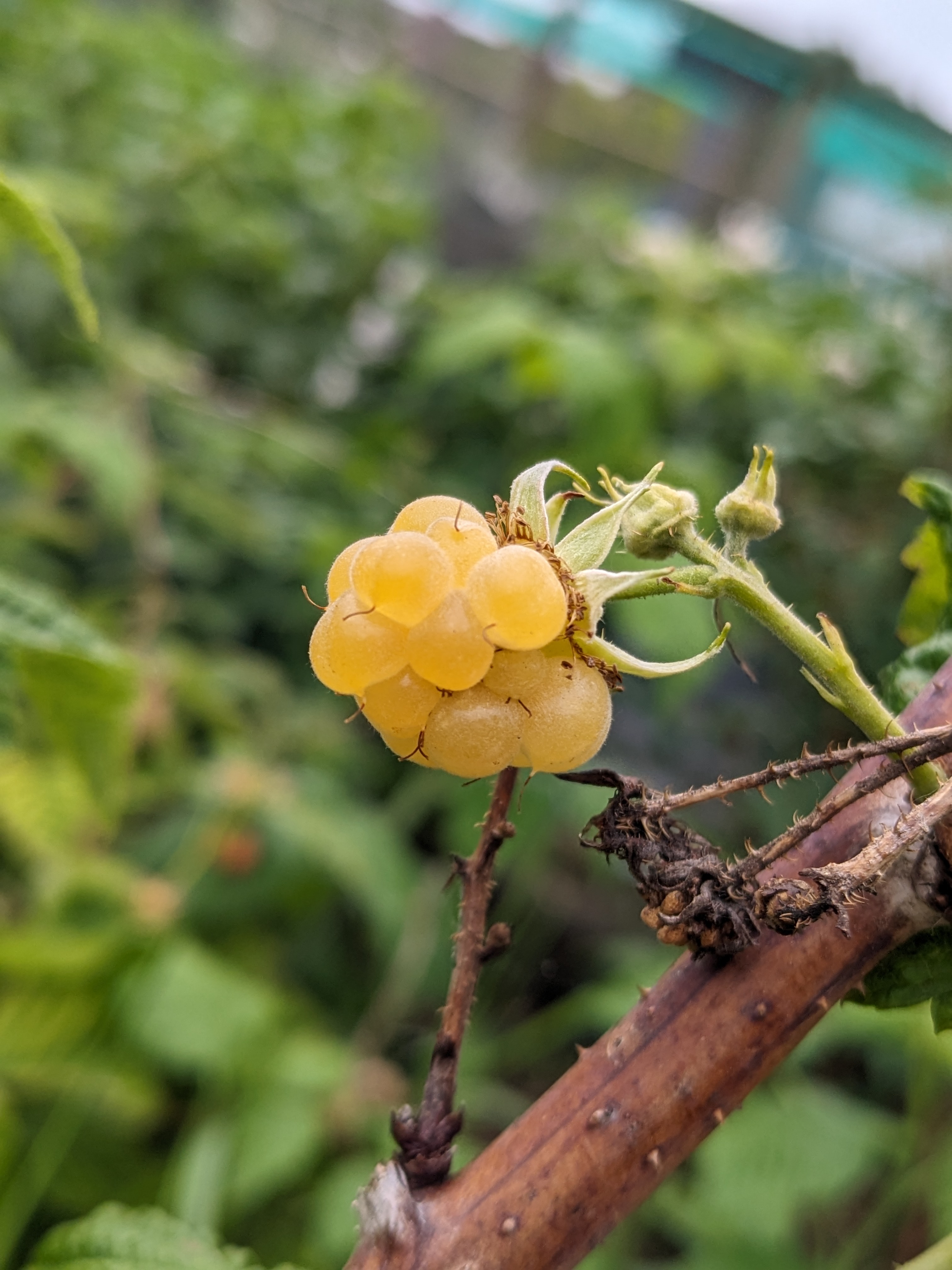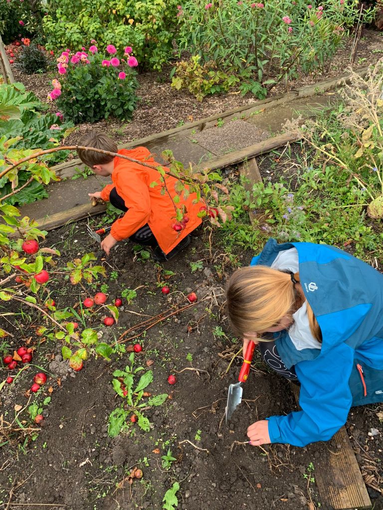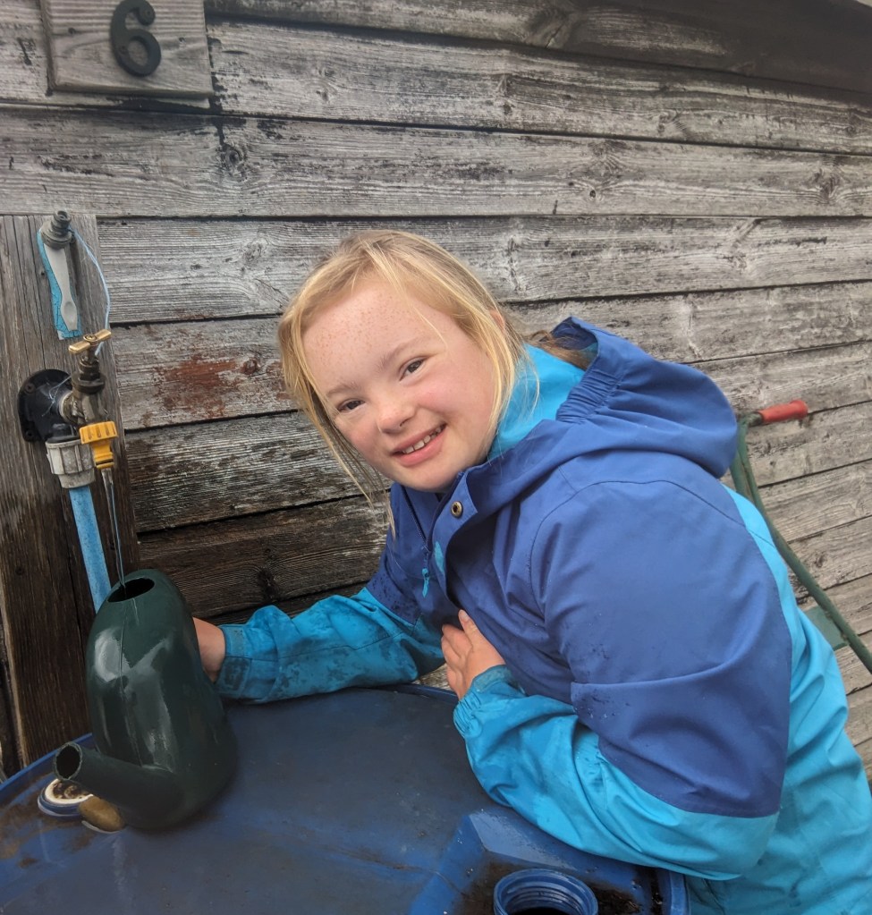 As soon as the rain showed signs of slowing, Dexter and Poppy began to dig up the potatoes in the bed by the Stumpery. Even with the rain, they kept going, turning over the soil with a trowel, spade and hands, filling a bag with Charlotte potatoes. Jasmine decided that she would supervise their work from the bench by the shed and I sat with her to keep her company. Several minutes later, I realised she had fallen asleep. Clearly, all the fresh air had worn her out! The heavens opened while Jasmine was asleep so the others came back to the shed to hide from the worst of the rain. The torrent continued impressively for quite a long time. The water was pouring off the edge of the sail like a waterfall!