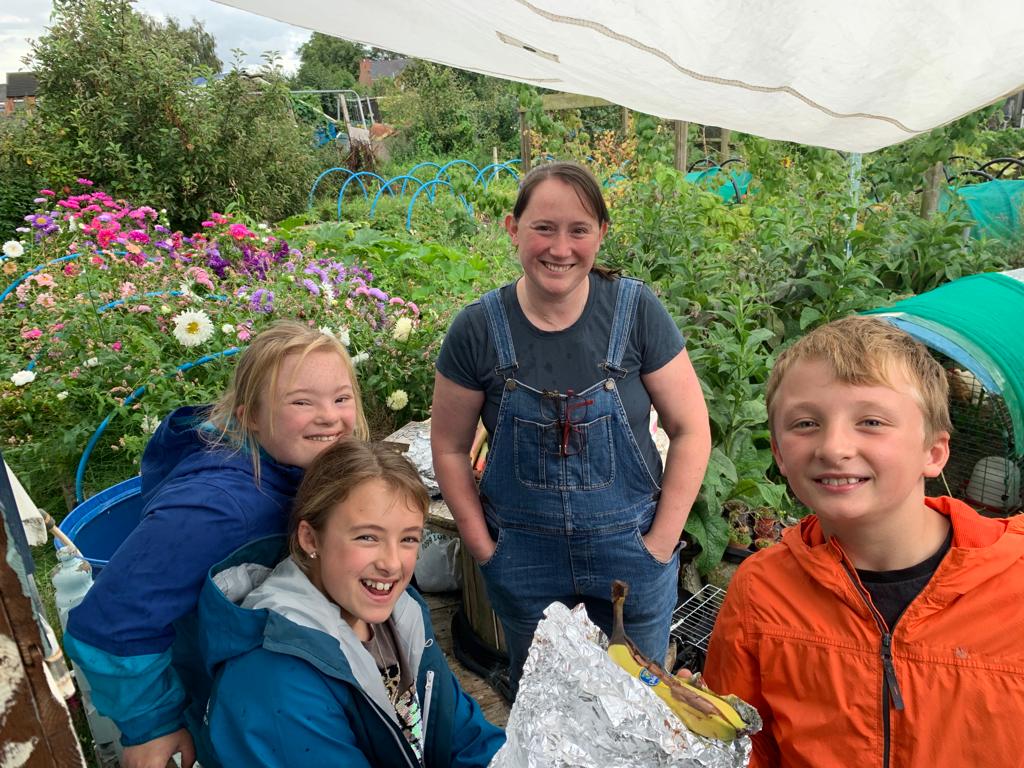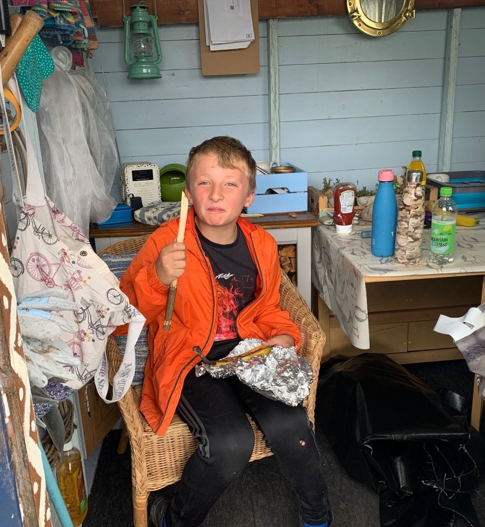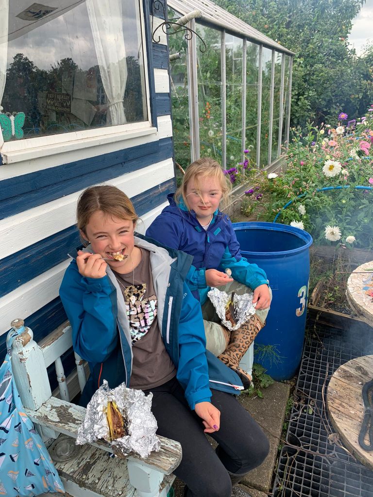 With the liner now in, we decided to take a break and go for a walk around site. Dexter was full of questions and has a keen eye for foraging opportunities. We harvested raspberries and Jasmine helped me pick the rhubarb. Geoff had said we could pick some of his runner beans so we collected some before heading back to the shed. Beth headed off to do some jobs so the children and I decided to take a well deserved hot chocolate break. The stove had gone out but it was only a matter of a couple of minutes to get it going again. Four steaming mugs of hot chocolate with marshmallows tastes absolutely incredible when enjoyed outside. It didn’t take long for us all to finish our drinks and it seemed like a good idea to have pudding. Each of the children prepared their banana, slicing it down the middle and adding squares of chocolate before wrapping it up in silver foil. The bananas can’t be put directly on the stove, so I used a grill over the top to make sure they didn’t burn. As delicious as the pudding would be, I knew from experience it would take a while for it to be ready.
