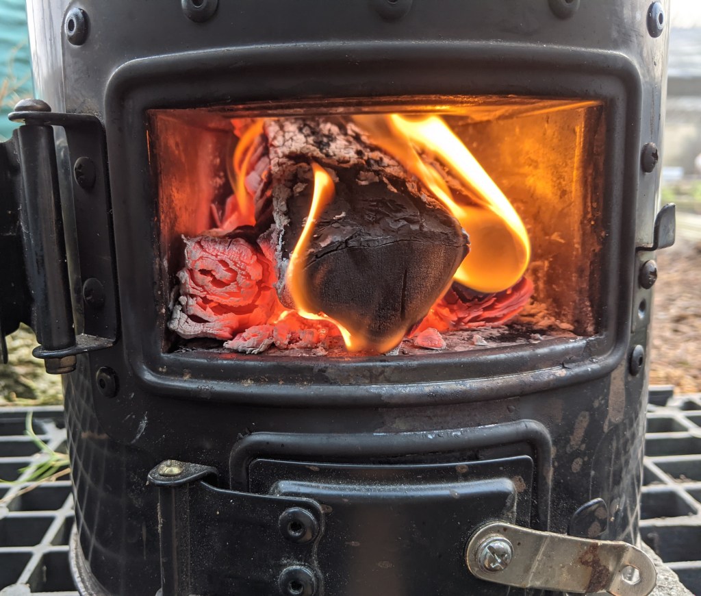 When I got to the plot, laiden with food stores and equipment to cook it, I opened up the shed and put up the sail. The forecast was for rain most of the afternoon and with the sail up, there would be a dry space where we could shelter if needed. I hauled out the stove which hasn’t seen much use this summer thanks to the last six weeks being wet. It took a while for the fire to start but eventually, it got going!
