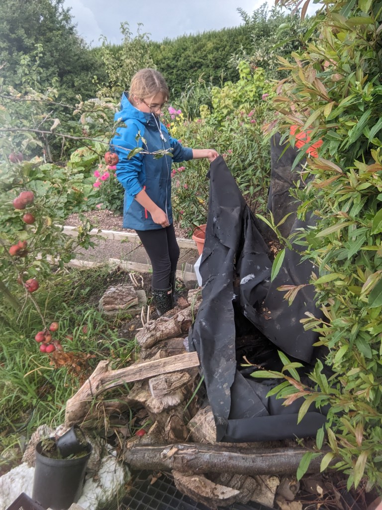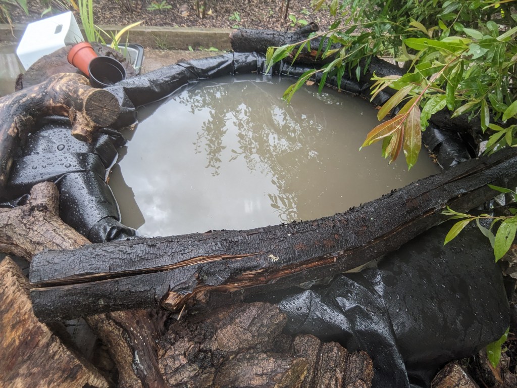The next stage was to put in the new liner. Poppy helped me unfold it and we tried to work out how to fit it to the pond. We opened it out all the way and decided it was too big. But when folded in half, it was too narrow. In the end we compromised with keeping one section folded with the rest open. All hands were needed to get it into place and more hands to hold the liner still whilst I went around, cutting away the excess liner. I left a good margin which meant we could tuck it away by the side of the pond and hold it in place with the logs. The fold in the middle of the pond would make a good hiding place for small aquatic animals like snails or newts. I’m still holding out for frogs spawn in the spring!