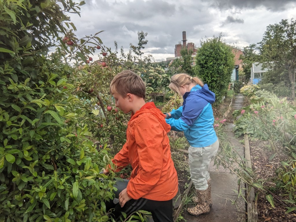 As soon as the rain slowed, the children packed up their things and walked back to the car. They took their harvest (the bits that hadn’t already been eaten) and I promised Dexter that they would come back soon to help me set up the Worm Farm. I walked back to the shed, collected up the saucepan and frying pan, took down the sodden sail and shut up the shed. I ambled home, squelching as I went. I really must remember to take a coat to the allotment on days like today!