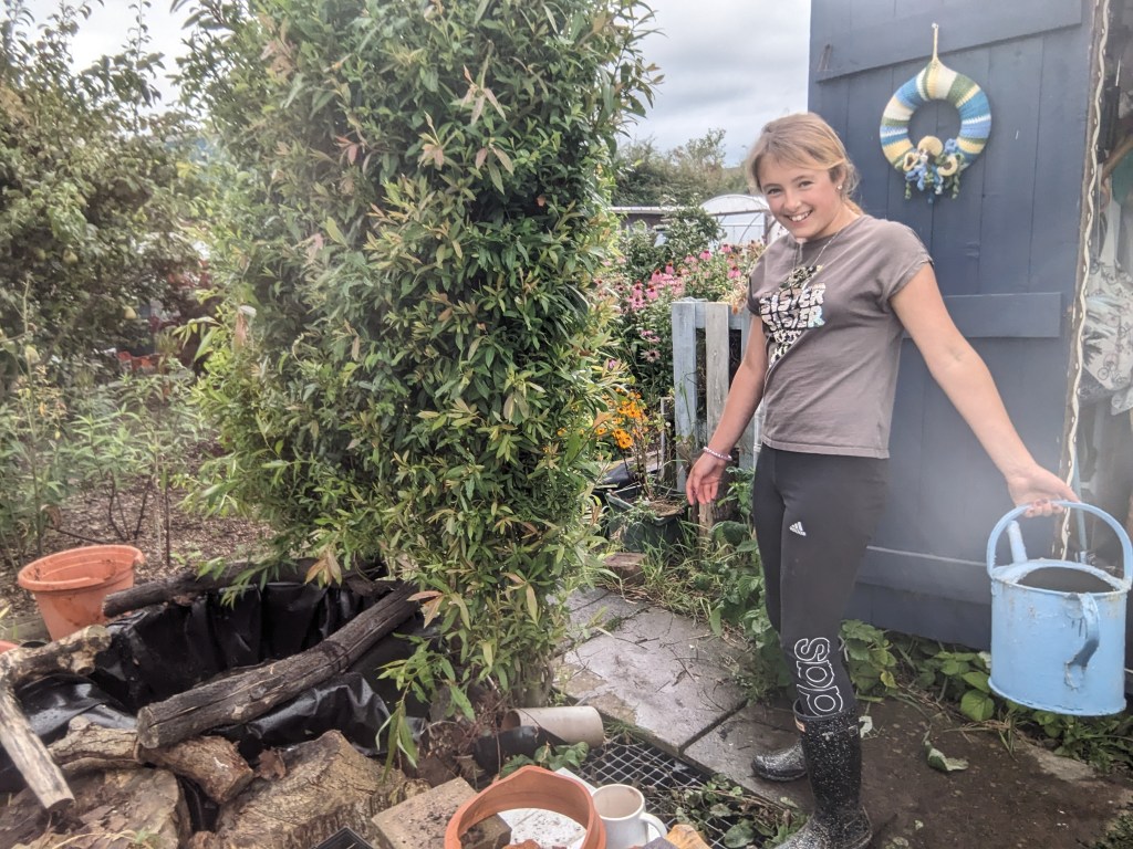 So back to the pond! I armed all three of the children with watering cans and set them to work filling the pond. As you would expect, there was much hilarity and everyone got rather sodden, mainly from Jasmine waving her watering can around, taking great enjoyment in splashing us all in turn. With the pond now full to the brim, it was time for pudding.