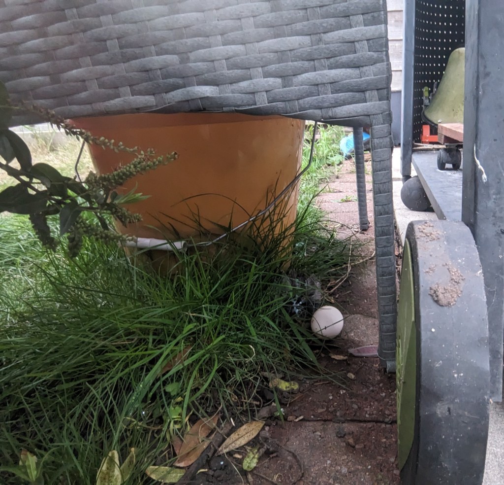 Over the last week, the Topknot Gang has been keeping me on my toes by laying stealth eggs. These can be laid anywhere. Under bushes, in the middle of the patio, next to the BBQ… The hiding places are endless!
