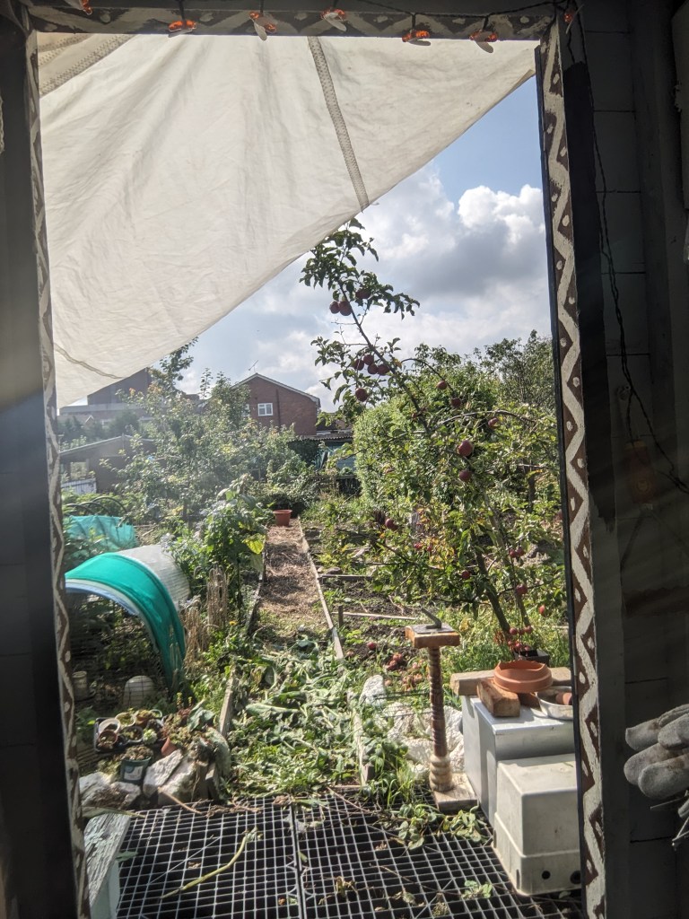 After opening up the shed, I decided to put up the sail. I designed it as a sunshade as the plot has very little shading. Most of this summer, the sail has been used as a glorified umbrella so it was great to have it up and out in the weather it was designed for! I checked on all the chickens and spent a little time checking on the girls in the main coop. Geoff’s black rock is still being picked on but she’s beginning to hold her own a bit more.
