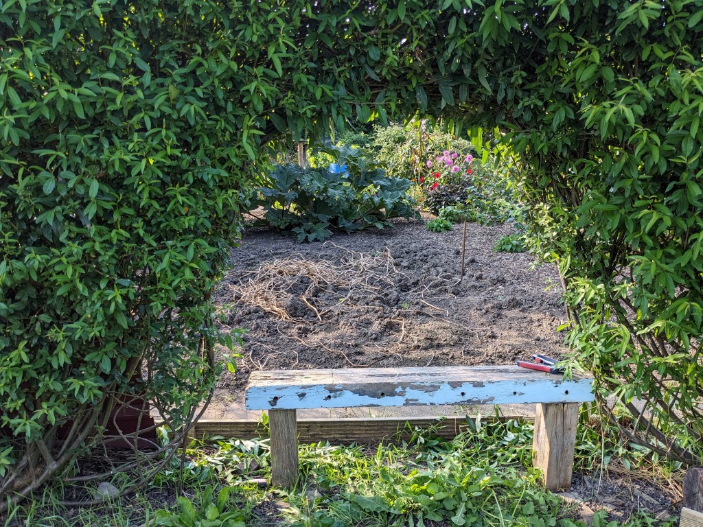 With weeding clearly horrendous and my supplies of cold drinks beginning to run low, I chose an easier option which allowed me to spend some time in the shade, trimming the willow. It’s September and in theory, this should be the last time I prune it. However, I suspect that I’ll be doing this well into October if the weather stays warm. The willow screen was a quick job and I moved onto the willow arch. I am always really conscious about the path being clear for people walking past. This, I always start on the path side. The downside of this approach is that by the time I have turned the corner and begin to work my way back up the plot side of the willow arch, my hands are hurting and my enthusiasm is waning. I forced myself to go all the way to the far side of the arch before giving up.