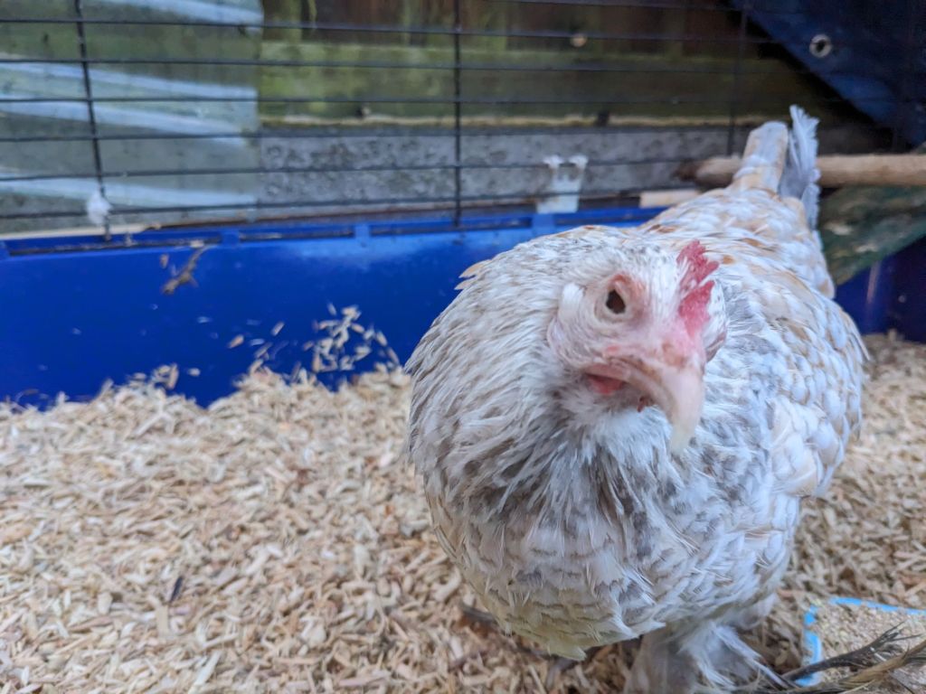 Then it struck me. Why couldn’t Gertie stay overnight in one of the Omlets with the Topknot Gang? If I waited until they had taken themselves to bed, they would be unlikely to pick on her in the dark. Making up my mind to try it, I picked up a very grumpy Gertie who clearly was not impressed with being woken up and carried. I closed the nest box door on the purple Omlet and opened up the side door. What I saw explained why the nest never has any bedding in. All four of the moronic birds had fitted themselves into the nest. The best is designed for a single bird but clearly no one had told the girls this! I swear Cumulus was standing on top of Aurora, whilst Arcus was perched precariously on the edge of the nest. I couldn’t see Coco but I assumed she was underneath Arcus somewhere.