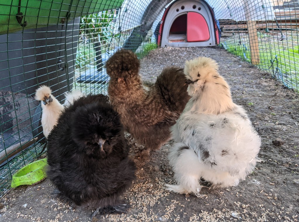 When I went out into the garden at lunchtime today I discovered Asperitas huddled in the run by herself. The rest of the Topknot Gang were out exploring the garden and even Gertie was out pottering around.