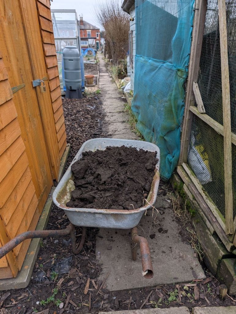 After mollifying those two, I went to the shed and found the shovel. The next problem was digging out the wheelbarrow which has stood on our plot for over a year without being used. Unsurprisingly, the wheel was completely flat. I refused to be beaten by a punctured tyre. So I set off to see if I could borrow someone else’s wheelbarrow. After ambling around the site for a bit, I managed it and trundled it back to the plot.